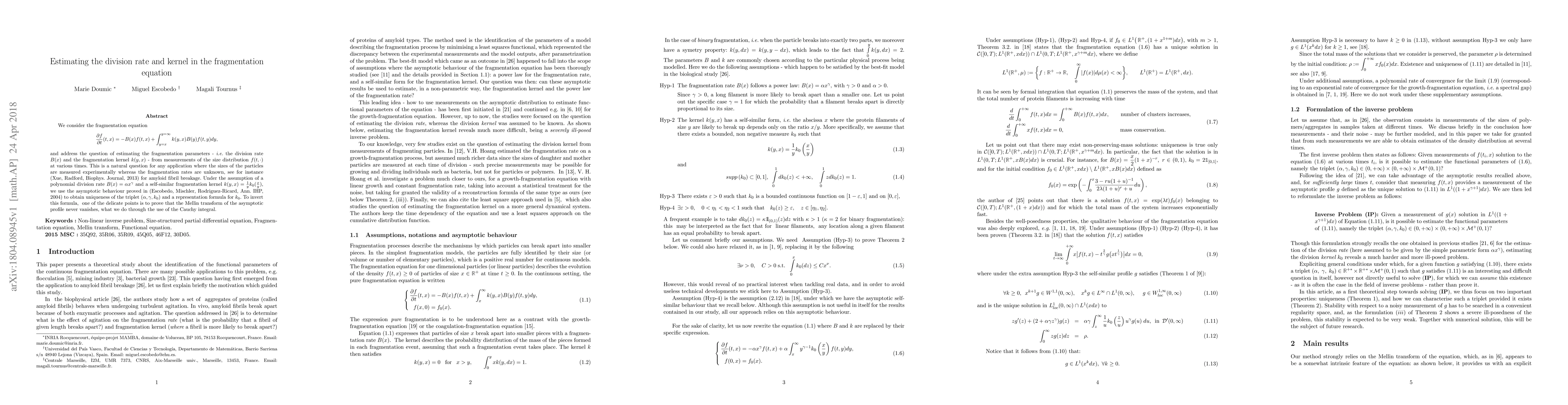This paper estimates the division rate $B(x)$ and fragmentation kernel $k(y, x)$ in the fragmentation equation from size distribution measurements. It uses polynomial and self-similar assumptions to derive a representation formula for the kernel, proving its non-vanishing Mellin transform via the Cauchy integral.