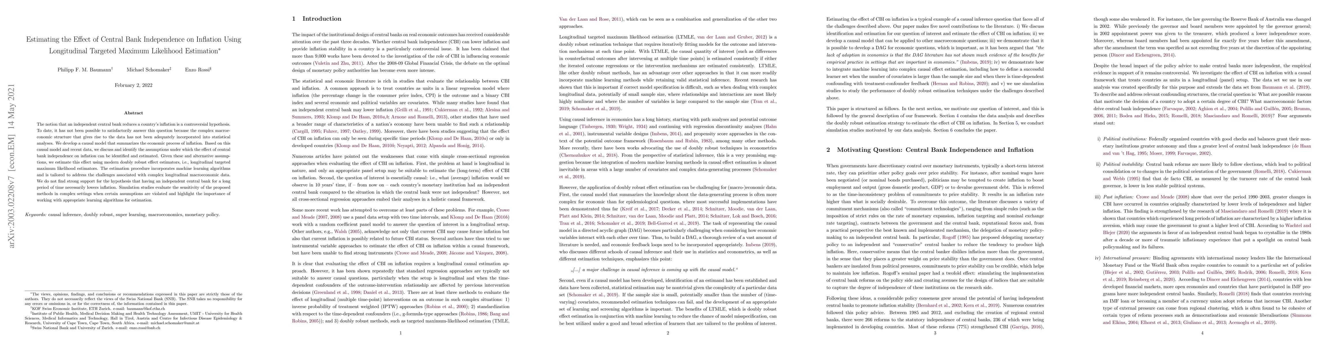 This paper develops a causal model to estimate the effect of central bank independence on inflation, using advanced longitudinal targeted maximum likelihood estimation techniques. The study finds no strong evidence supporting the hypothesis that central bank independence consistently lowers inflation over time, emphasizing the importance of appropriate machine learning algorithms in complex macroeconomic data analysis.