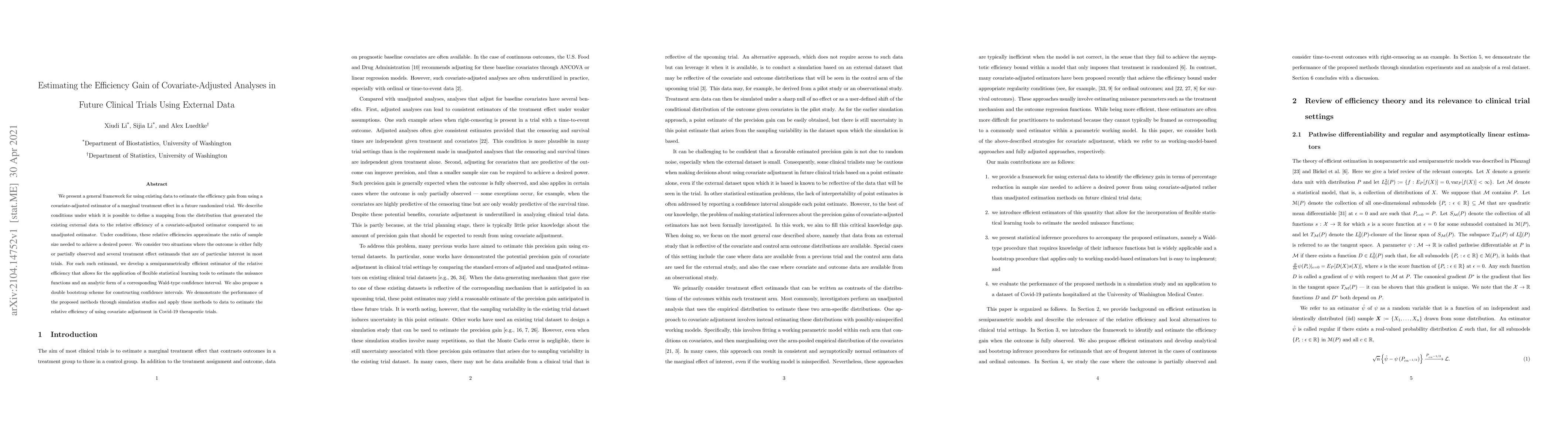 This paper introduces a framework for estimating the efficiency gain from covariate-adjusted analyses in future clinical trials using existing external data. It proposes semiparametric estimators and a double bootstrap scheme to approximate the sample size ratio needed for desired power, demonstrating the method through simulations and Covid-19 trial data.