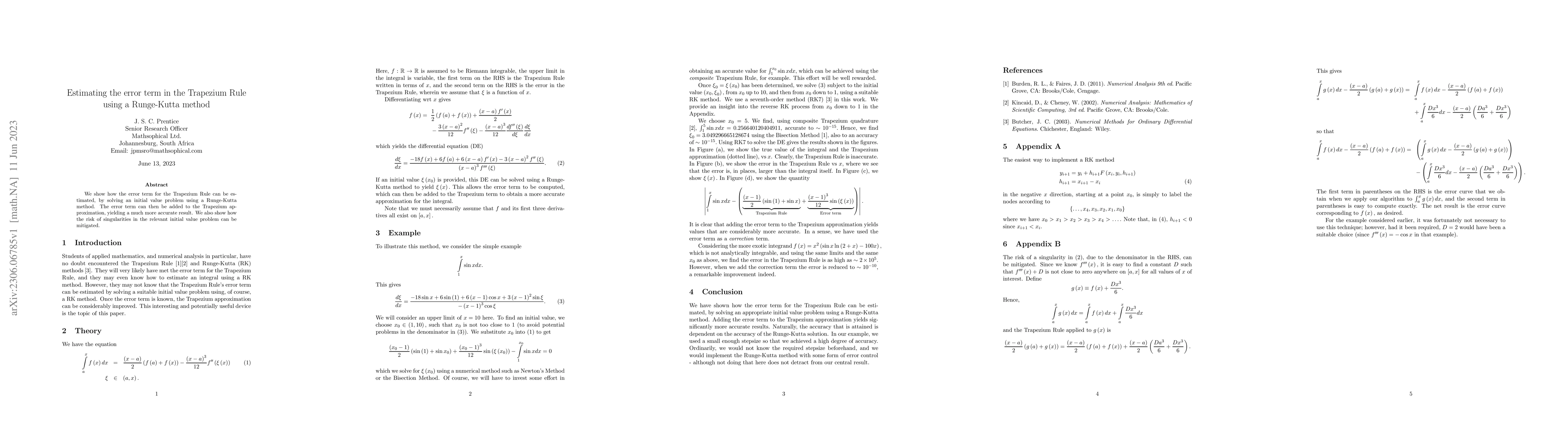 We show how the error term for the Trapezium Rule can be estimated, by solving an initial value problem using a Runge-Kutta method. The error term can then be added to the Trapezium approximation, yielding a much more accurate result. We also show how the risk of singularities in the relevant initial value problem can be mitigated.