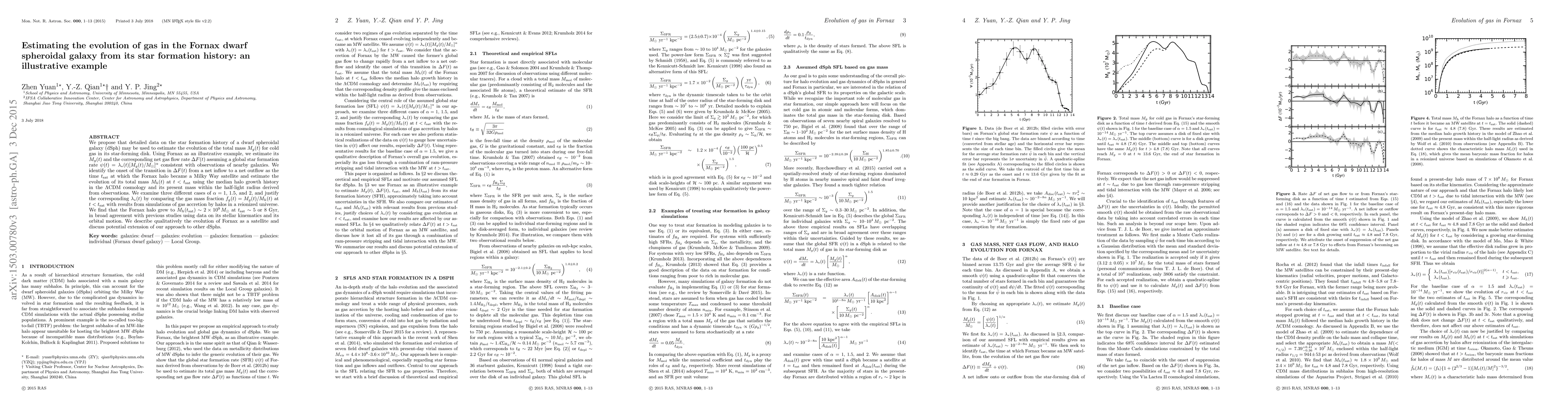 This paper estimates the evolution of cold gas mass in the Fornax dwarf spheroidal galaxy using its star formation history, identifying a transition from gas inflow to outflow when Fornax became a Milky Way satellite. The study finds the Fornax halo grew to ~2x10^9 M_sun at 5-8 Gyr, consistent with previous studies, and suggests a method for applying this approach to other dwarf spheroidal galaxies.