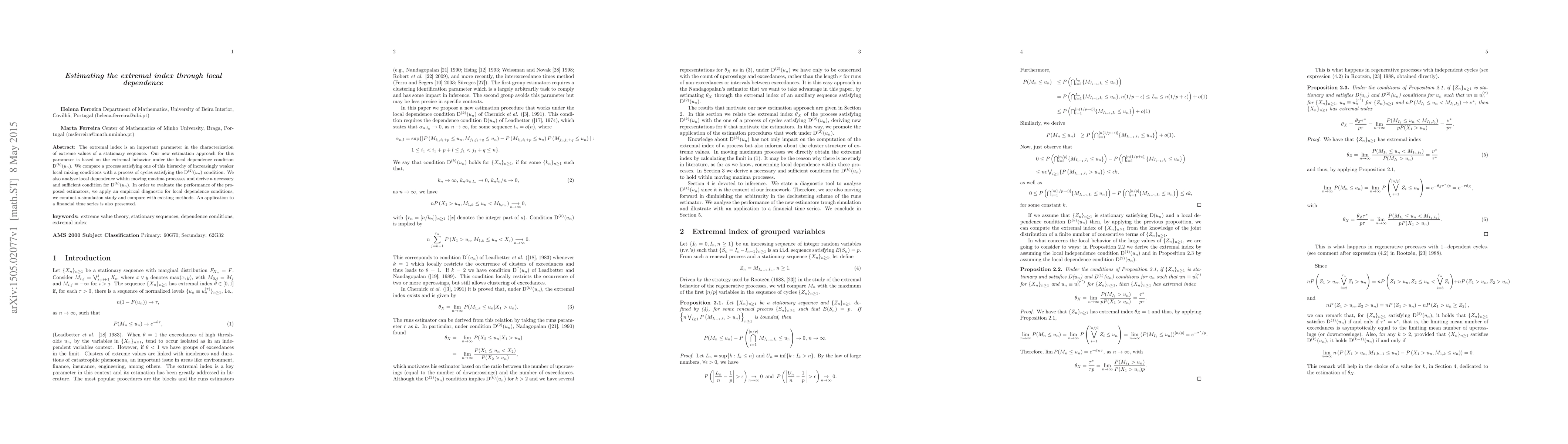 This paper proposes a new method for estimating the extremal index based on local dependence conditions, comparing it with processes under weaker local mixing conditions. The study evaluates the performance through simulations and an empirical application to a financial time series, providing a necessary and sufficient condition for the local dependence hierarchy.