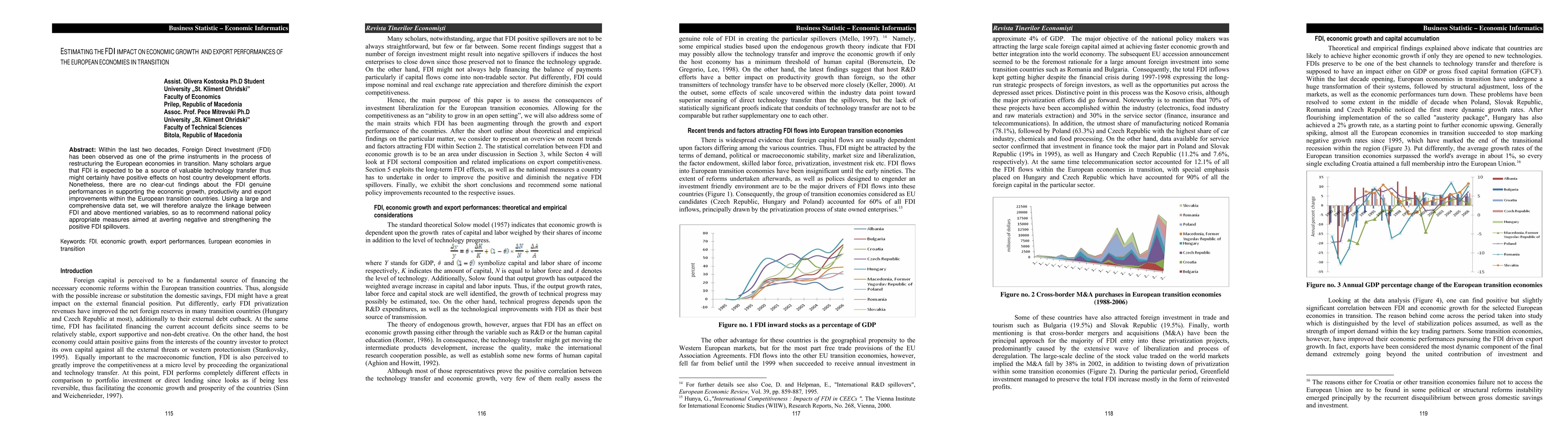 Within the last two decades, Foreign Direct Investment (FDI) has been observed as one of the prime instruments in the process of restructuring the European economies in transition. Many scholars argue that FDI is expected to be a source of valuable technology transfer thus might certainly have positive effects on host country development efforts. Nonetheless, there are no clear-cut findings about the FDI genuine performances in supporting the economic growth, productivity and export improvements within the European transition countries. Using a large and comprehensive data set, we will therefore analyze the linkage between FDI and above mentioned variables, so as to recommend national policy appropriate measures aimed at averting negative and strengthening the positive FDI spillovers.