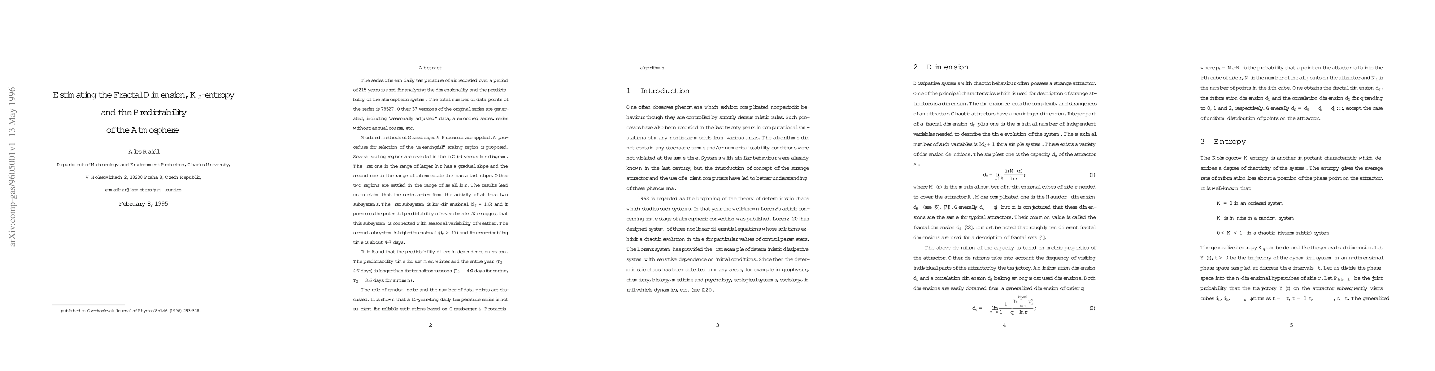 The series of mean daily temperature of air recorded over a period of 215 years is used for analysing the dimensionality and the predictability of the atmospheric system. The total number of data points of the series is 78527. Other 37 versions of the original series are generated, including ``seasonally adjusted'' data, a smoothed series, series without annual course, etc. Modified methods of Grassberger and Procaccia are applied. A procedure for selection of the ``meaningful'' scaling region is proposed. Several scaling regions are revealed in the ln C(r) versus ln r diagram. The first one in the range of larger ln r has a gradual slope and the second one in the range of intermediate ln r has a fast slope. Other two regions are settled in the range of small ln r. The results lead us to claim that the series arises from the activity of at least two subsystems. The first subsystem is low-dimensional (d_f=1.6) and it possesses the potential predictability of several weeks. We suggest that this subsystem is connected with seasonal variability of weather. The second subsystem is high-dimensional (d_f>17) and its error-doubling time is about 4-7 days. It is found that the predictability differs in dependence on season. The predictability time for summer, winter and the entire year (T_2 approx. 4.7 days) is longer than for transition-seasons (T_2 approx. 4.0 days for spring, T_2 approx. 3.6 days for autumn). The role of random noise and the number of data points are discussed. It is shown that a 15-year-long daily temperature series is not sufficient for reliable estimations based on Grassberger and Procaccia algorithms.