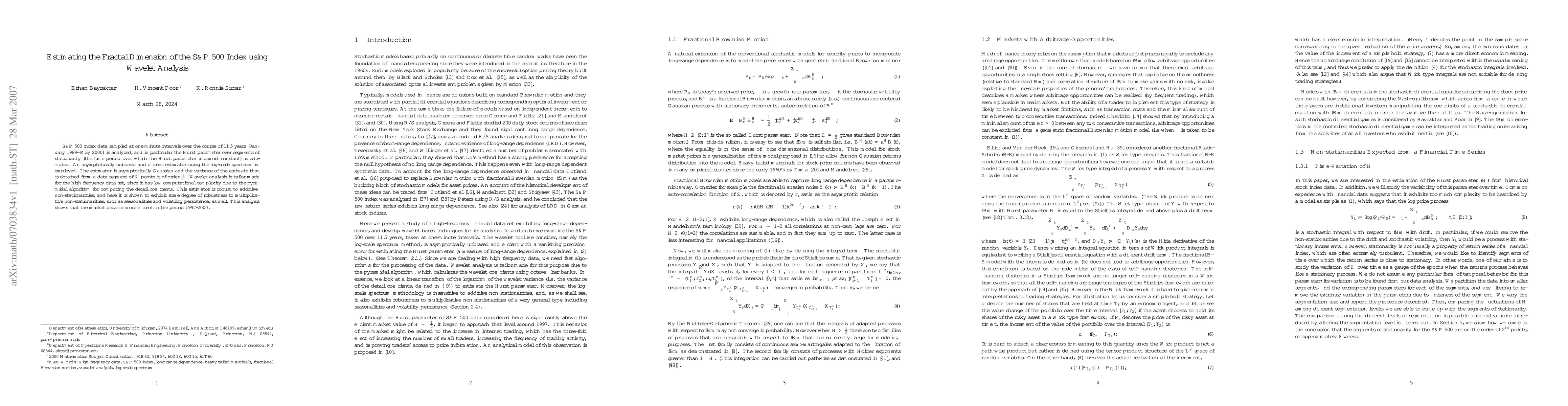 S&P 500 index data sampled at one-minute intervals over the course of 11.5 years (January 1989- May 2000) is analyzed, and in particular the Hurst parameter over segments of stationarity (the time period over which the Hurst parameter is almost constant) is estimated. An asymptotically unbiased and efficient estimator using the log-scale spectrum is employed. The estimator is asymptotically Gaussian and the variance of the estimate that is obtained from a data segment of $N$ points is of order $\frac{1}{N}$. Wavelet analysis is tailor made for the high frequency data set, since it has low computational complexity due to the pyramidal algorithm for computing the detail coefficients. This estimator is robust to additive non-stationarities, and here it is shown to exhibit some degree of robustness to multiplicative non-stationarities, such as seasonalities and volatility persistence, as well. This analysis shows that the market became more efficient in the period 1997-2000.