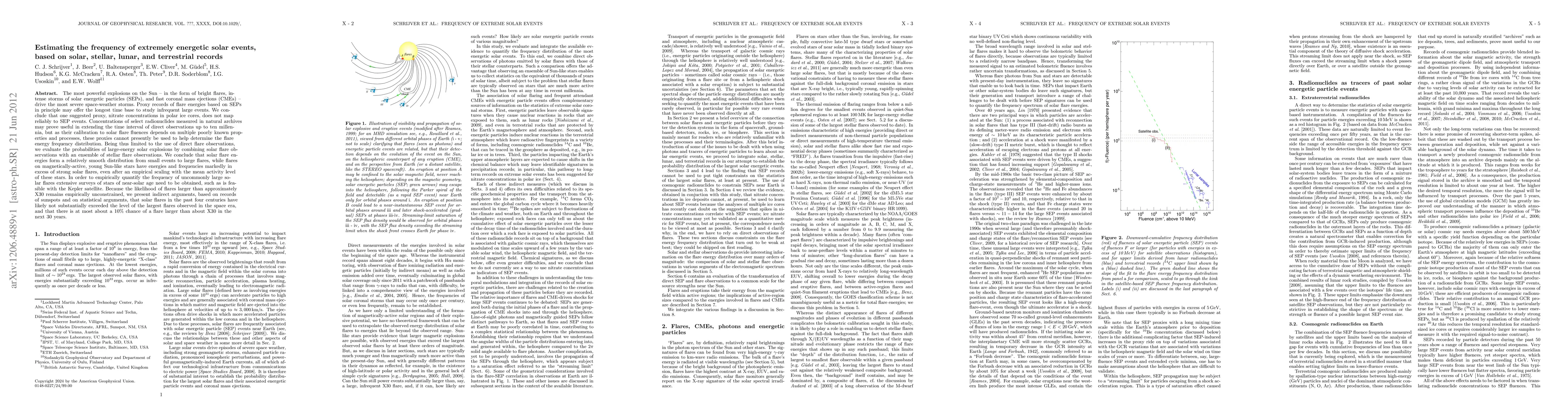 The most powerful explosions on the Sun [...] drive the most severe space-weather storms. Proxy records of flare energies based on SEPs in principle may offer the longest time base to study infrequent large events. We conclude that one suggested proxy, nitrate concentrations in polar ice cores, does not map reliably to SEP events. Concentrations of select radionuclides measured in natural archives may prove useful in extending the time interval of direct observations up to ten millennia, but as their calibration to solar flare fluences depends on multiple poorly known properties and processes, these proxies cannot presently be used to help determine the flare energy frequency distribution. Being thus limited to the use of direct flare observations, we evaluate the probabilities of large-energy solar explosions by combining solar flare observations with an ensemble of stellar flare observations. We conclude that solar flare energies form a relatively smooth distribution from small events to large flares, while flares on magnetically-active, young Sun-like stars have energies and frequencies markedly in excess of strong solar flares, even after an empirical scaling with the mean activity level of these stars. In order to empirically quantify the frequency of uncommonly large solar flares extensive surveys of stars of near-solar age need to be obtained, such as is feasible with the Kepler satellite. Because the likelihood of flares larger than approximately X30 remains empirically unconstrained, we present indirect arguments, based on records of sunspots and on statistical arguments, that solar flares in the past four centuries have likely not substantially exceeded the level of the largest flares observed in the space era, and that there is at most about a 10% chance of a flare larger than about X30 in the next 30 years.
