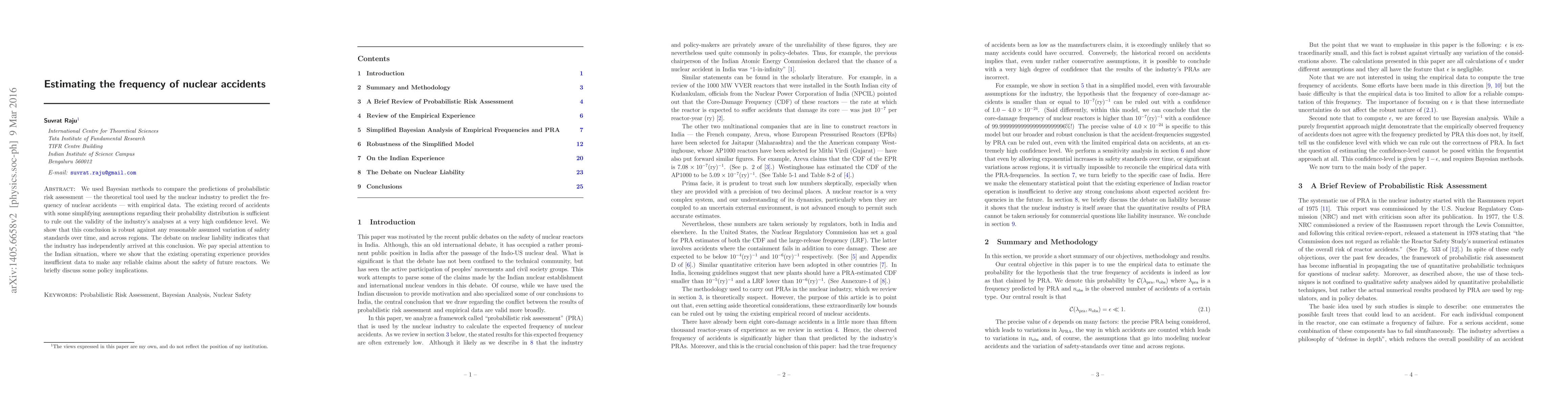 We used Bayesian methods to compare the predictions of probabilistic risk assessment -- the theoretical tool used by the nuclear industry to predict the frequency of nuclear accidents -- with empirical data. The existing record of accidents with some simplifying assumptions regarding their probability distribution is sufficient to rule out the validity of the industry's analyses at a very high confidence level. We show that this conclusion is robust against any reasonable assumed variation of safety standards over time, and across regions. The debate on nuclear liability indicates that the industry has independently arrived at this conclusion. We pay special attention to the Indian situation, where we show that the existing operating experience provides insufficient data to make any reliable claims about the safety of future reactors. We briefly discuss some policy implications.
