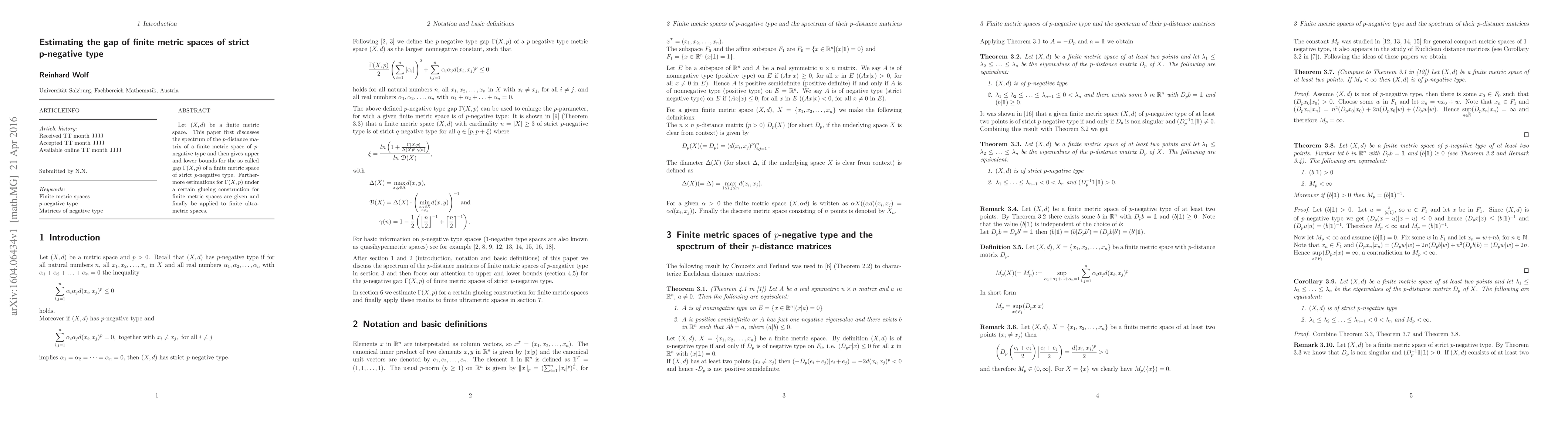 Let (X,d) be a finite metric space. This paper first discusses the spectrum of the p-distance matrix of a finite metric space of p-negative type and then gives upper and lower bounds for the so called gap of a finite metric space of strict p-negative type. Furthermore estimations for the gap under a certain glueing construction for finite metric spaces are given and finally be applied to finite ultrametric spaces.