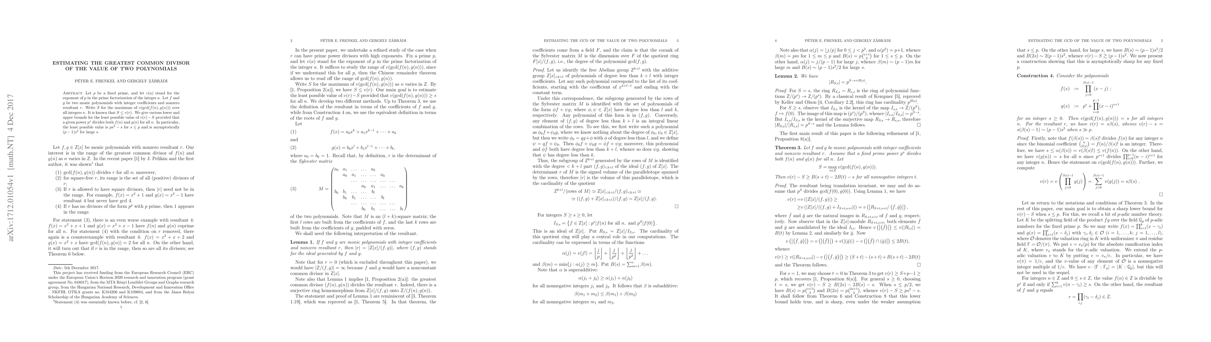 This paper investigates the greatest common divisor of values of two monic integer polynomials $f$ and $g$, focusing on the exponent of a fixed prime $p$ in their factorization. It provides bounds for the difference between the exponent of the resultant $r$ and the maximum exponent of $p$ dividing $f(n)$ and $g(n)$ for all integers $n$, showing that the least possible value is $ps^2-s$ for small $s$ and asymptotically $(p-1)s^2$ for large $s$.