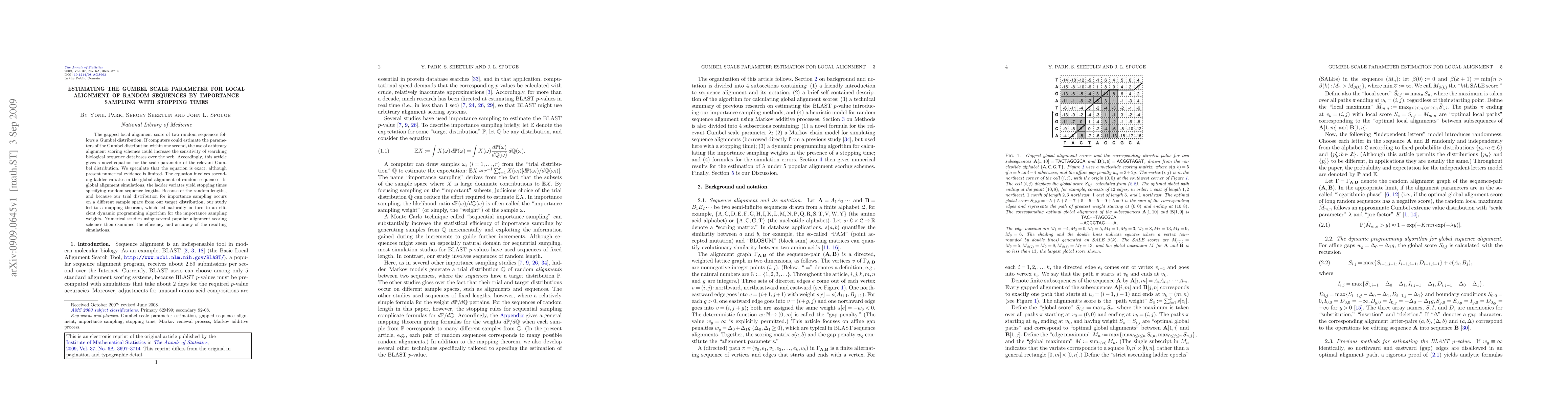 Researchers developed a novel equation for estimating the Gumbel scale parameter in local alignment of random sequences, enabling faster simulations and more sensitive searching of biological sequence databases. The study's dynamic programming algorithm improved efficiency and accuracy in aligning sequences with arbitrary scoring schemes.