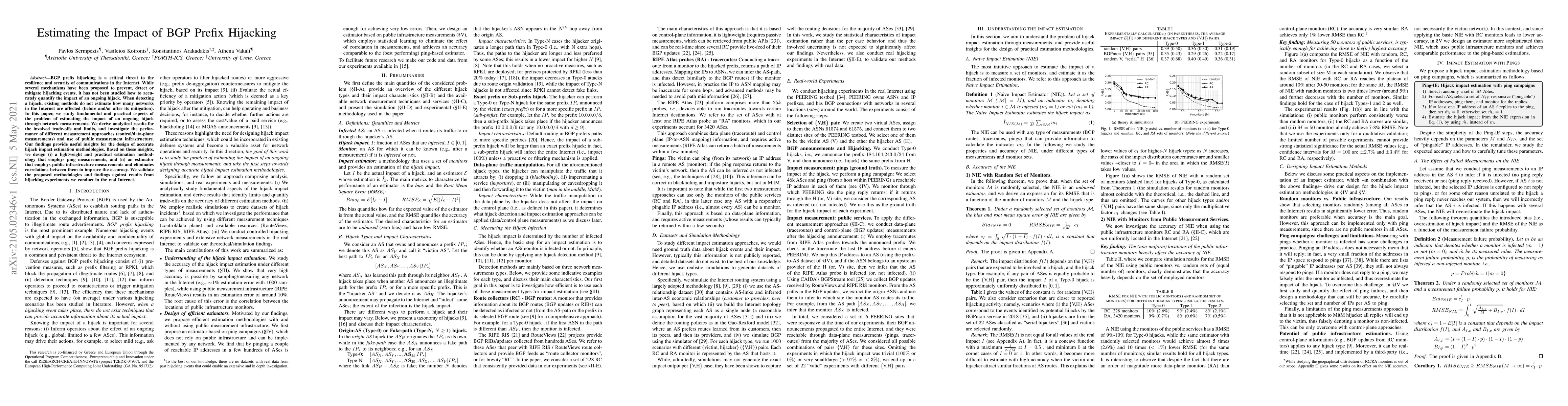 This paper investigates methods to estimate the impact of BGP prefix hijacking on Internet communications, proposing analytical results and practical measurement approaches. It introduces a lightweight ping-based estimation methodology and an improved estimator using public infrastructure, validated through real-world hijacking experiments.