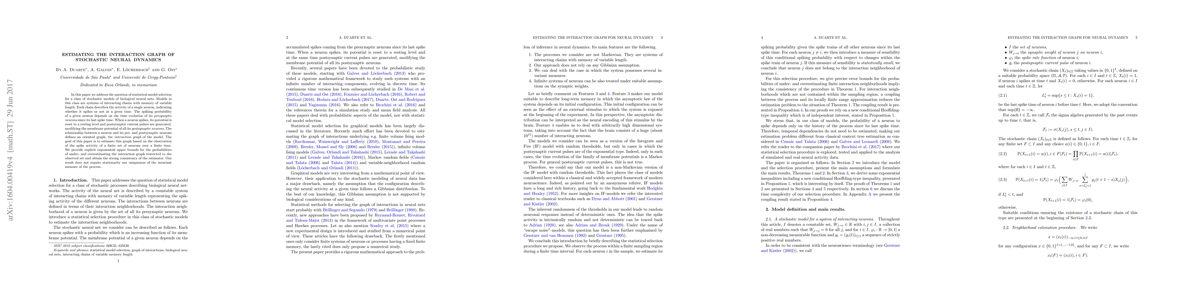This paper proposes a method for estimating the interaction graph of stochastic neural networks based on observed spike activity. It provides explicit bounds for estimating errors and demonstrates strong consistency of the estimator without requiring stationarity or uniqueness of the process's invariant measure.