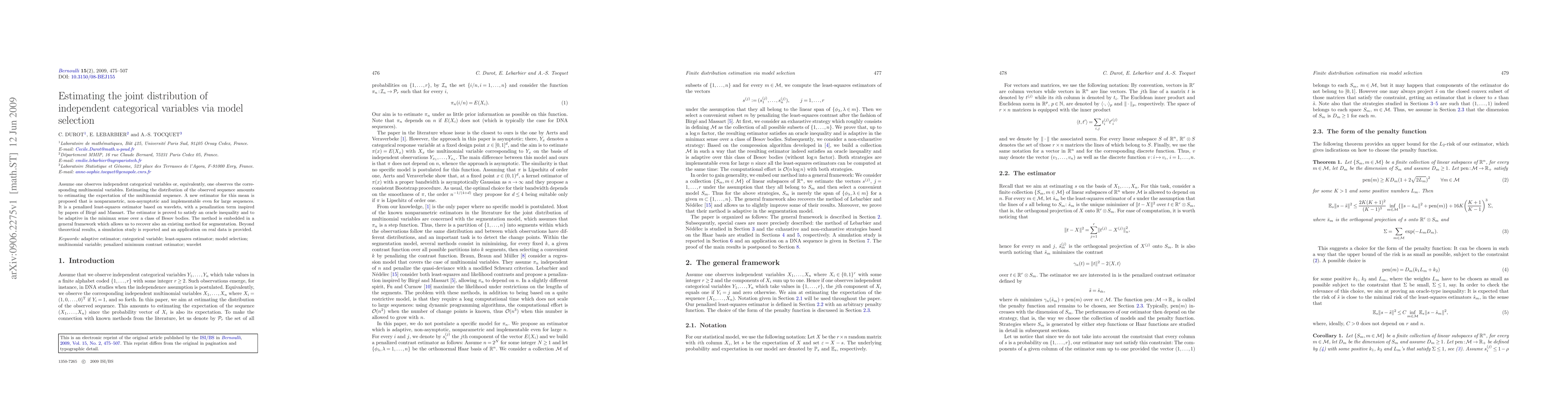 A new method for estimating the distribution of independent categorical variables is proposed, using a penalized least-squares estimator based on wavelets that satisfies an oracle inequality and is adaptive in the minimax sense.