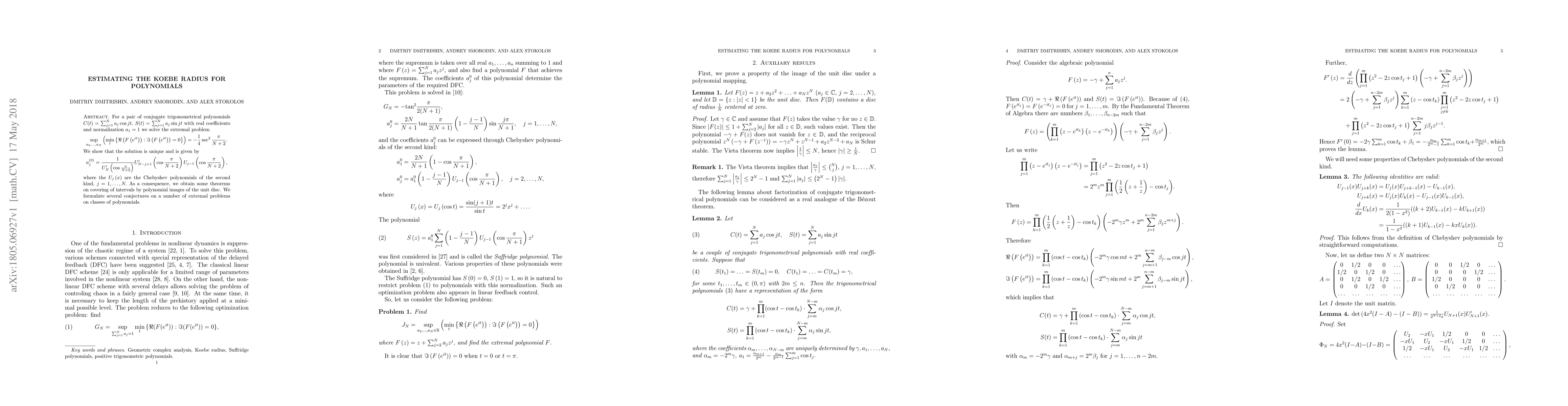 For a pair of conjugate trigonometrical polynomials $C (t) = \sum_ { j = 1 } ^N { { a_j}\cos jt }, S(t) = \sum_ { j = 1 } ^N { { a_j}\sin jt }$ with real coefficients and normalization ${a_1} = 1 $ we solve the extremal problem \[ \sup_ {a_2,...,a_N} \left ({ \min_t \left\{ {\Re \left ({ F\left ({ { e^ {it} } } \right) } \right): \Im \left ({ F\left ({ { e^ {it} } } \right) } \right) = 0 } \right\} } \right) = -\frac14 \sec ^2\frac\pi{N + 2}. \] We show that the solution is unique and is given by \[ a_j^ {(0)} = \frac {1} { { { U'_N}\left ({\cos \frac{\pi } { { N + 2 } } } \right) } } { U' _ { N - j + 1 } }\left ({\cos \frac{\pi } { { N + 2 } } } \right) { U_ { j - 1 } }\left ({\cos \frac{\pi } { { N + 2 } } } \right), \] where the $U_j(x)$ are the Chebyshev polynomials of the second kind, and the $U'_j(x)$ are their derivatives, $j = 1, \ldots, N.$ As a consequence, we obtain some theorems on covering of intervals by polynomial images of the unit disc. We formulate several conjectures on a number of extremal problems on classes of polynomials.