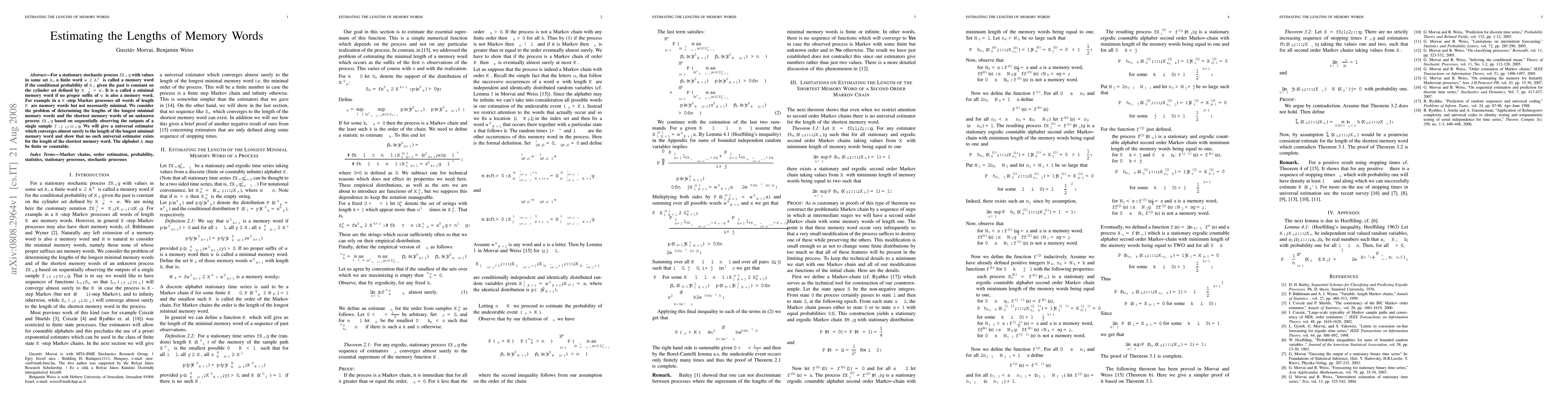 For a stationary stochastic process $\{X_n\}$ with values in some set $A$, a finite word $w \in A^K$ is called a memory word if the conditional probability of $X_0$ given the past is constant on the cylinder set defined by $X_{-K}^{-1}=w$. It is a called a minimal memory word if no proper suffix of $w$ is also a memory word. For example in a $K$-step Markov processes all words of length $K$ are memory words but not necessarily minimal. We consider the problem of determining the lengths of the longest minimal memory words and the shortest memory words of an unknown process $\{X_n\}$ based on sequentially observing the outputs of a single sample $\{\xi_1,\xi_2,...\xi_n\}$. We will give a universal estimator which converges almost surely to the length of the longest minimal memory word and show that no such universal estimator exists for the length of the shortest memory word. The alphabet $A$ may be finite or countable.