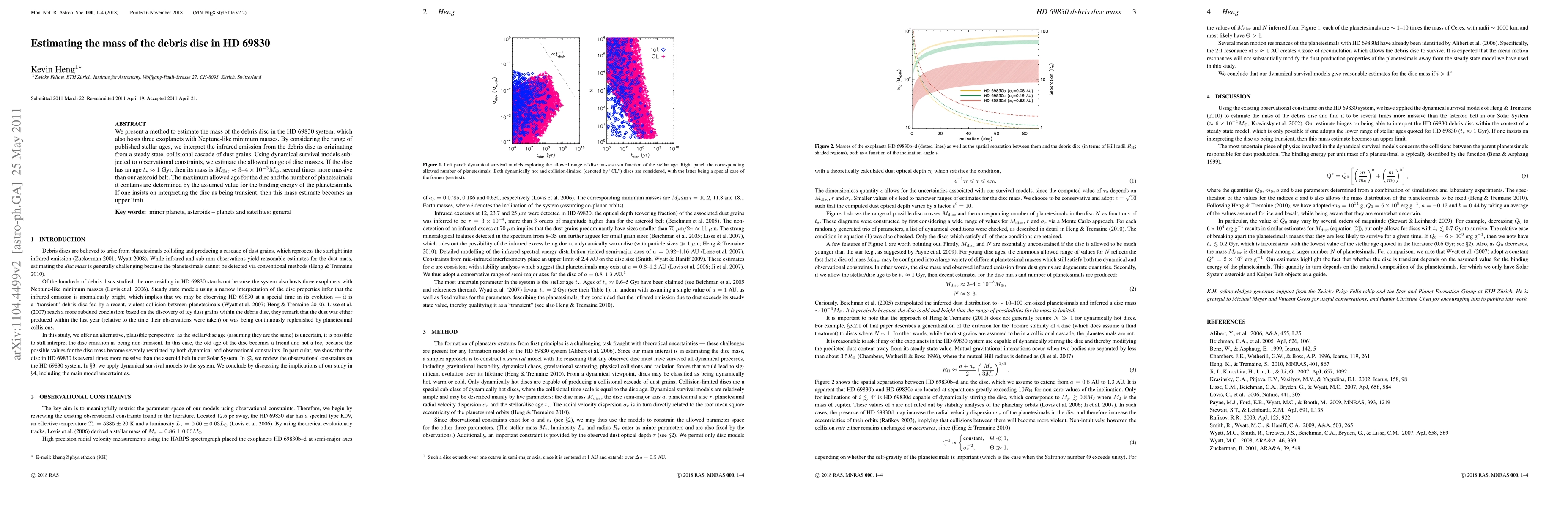 This paper estimates the mass of the debris disc around HD 69830, considering its infrared emission and dynamical models. The disc's mass is several times that of our asteroid belt if it is around 1 Gyr old, with the maximum age and planetesimal count depending on the assumed binding energy.