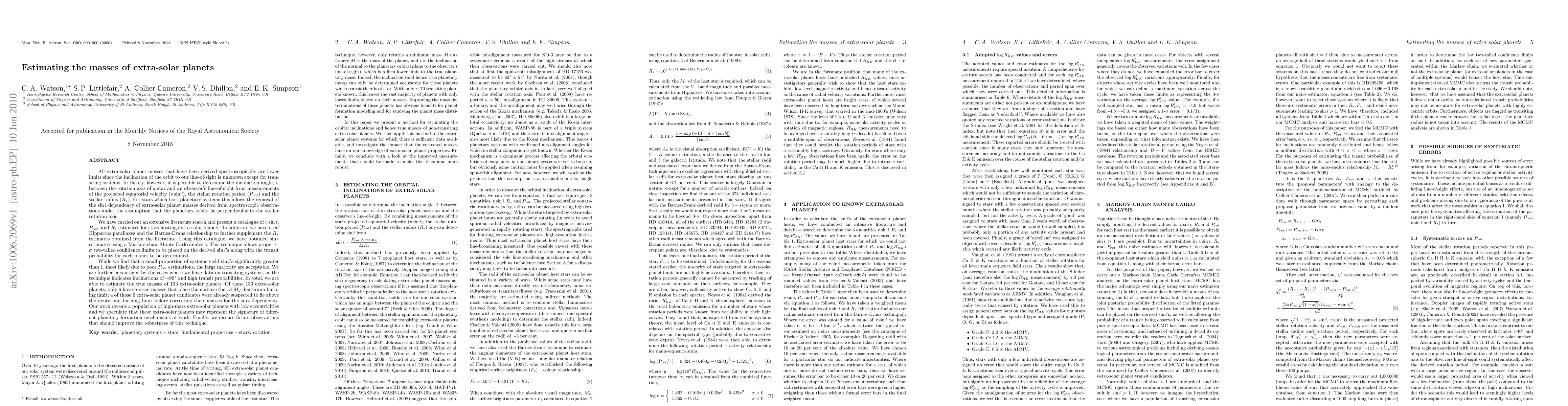 All extra-solar planet masses that have been derived spectroscopically are lower limits since the inclination of the orbit to our line-of-sight is unknown except for transiting systems. It is, however, possible to determine the inclination angle, i, between the rotation axis of a star and an observer's line-of-sight from measurements of the projected equatorial velocity (v sin i), the stellar rotation period (P_rot) and the stellar radius (R_star). This allows the removal of the sin i dependency of spectroscopically derived extra-solar planet masses under the assumption that the planetary orbits lie perpendicular to the stellar rotation axis. We have carried out an extensive literature search and present a catalogue of v sin i, P_rot, and R_star estimates for exoplanet host stars. In addition, we have used Hipparcos parallaxes and the Barnes-Evans relationship to further supplement the R_star estimates obtained from the literature. Using this catalogue, we have obtained sin i estimates using a Markov-chain Monte Carlo analysis. This allows proper 1-sigma two-tailed confidence limits to be placed on the derived sin i's along with the transit probability for each planet to be determined. While a small proportion of systems yield sin i's significantly greater than 1, most likely due to poor P_rot estimations, the large majority are acceptable. We are further encouraged by the cases where we have data on transiting systems, as the technique indicates inclinations of ~90 degrees and high transit probabilities. In total, we estimate the true masses of 133 extra-solar planets. Of these, only 6 have revised masses that place them above the 13 Jupiter mass deuterium burning limit. Our work reveals a population of high-mass planets with low eccentricities and we speculate that these may represent the signature of different planetary formation mechanisms at work.