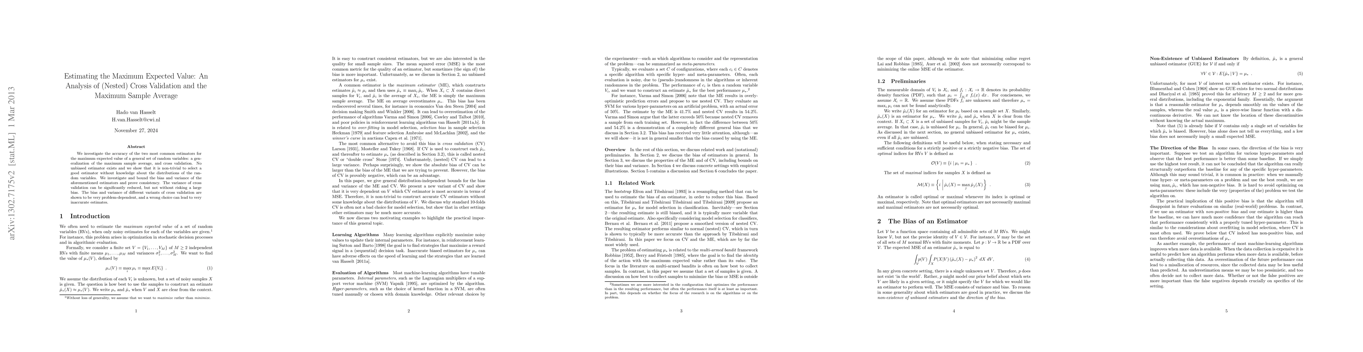 We investigate the accuracy of the two most common estimators for the maximum expected value of a general set of random variables: a generalization of the maximum sample average, and cross validation. No unbiased estimator exists and we show that it is non-trivial to select a good estimator without knowledge about the distributions of the random variables. We investigate and bound the bias and variance of the aforementioned estimators and prove consistency. The variance of cross validation can be significantly reduced, but not without risking a large bias. The bias and variance of different variants of cross validation are shown to be very problem-dependent, and a wrong choice can lead to very inaccurate estimates.