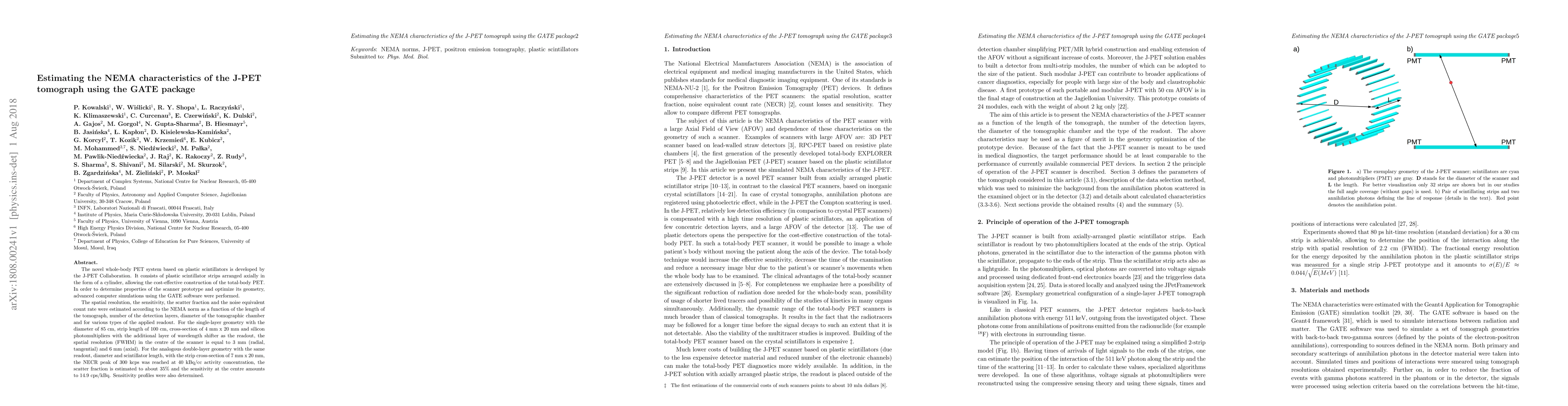 This paper estimates the NEMA characteristics of the J-PET tomograph using GATE simulations, finding a spatial resolution of 3 mm radial and tangential, 6 mm axial for single-layer geometry, and a peak NECR of 300 kcps for double-layer geometry with a scatter fraction of 35% and sensitivity of 14.9 cps/kBq at the center.