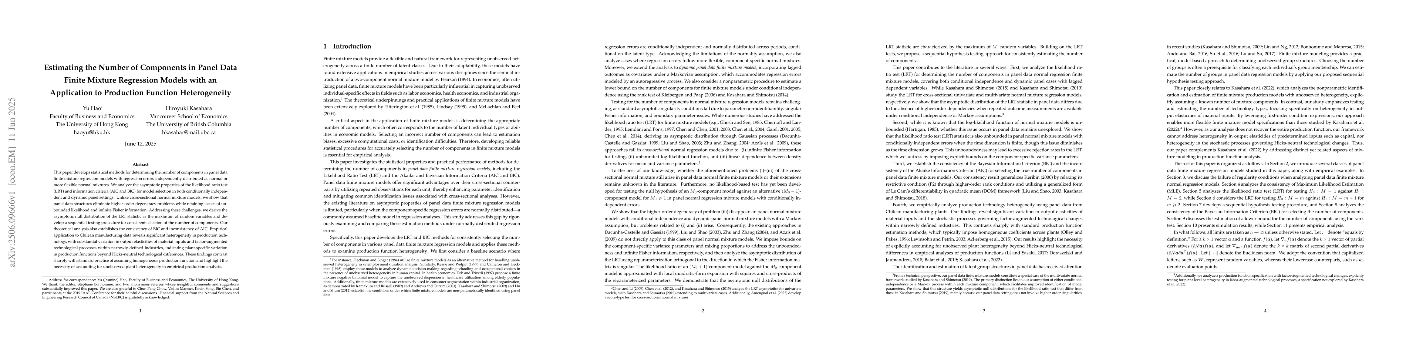 This paper develops statistical methods to estimate the number of components in panel data finite mixture regression models, revealing significant plant-specific variation in production functions beyond Hicks-neutral technological differences. The study highlights the importance of accounting for unobserved plant heterogeneity in empirical production analysis.