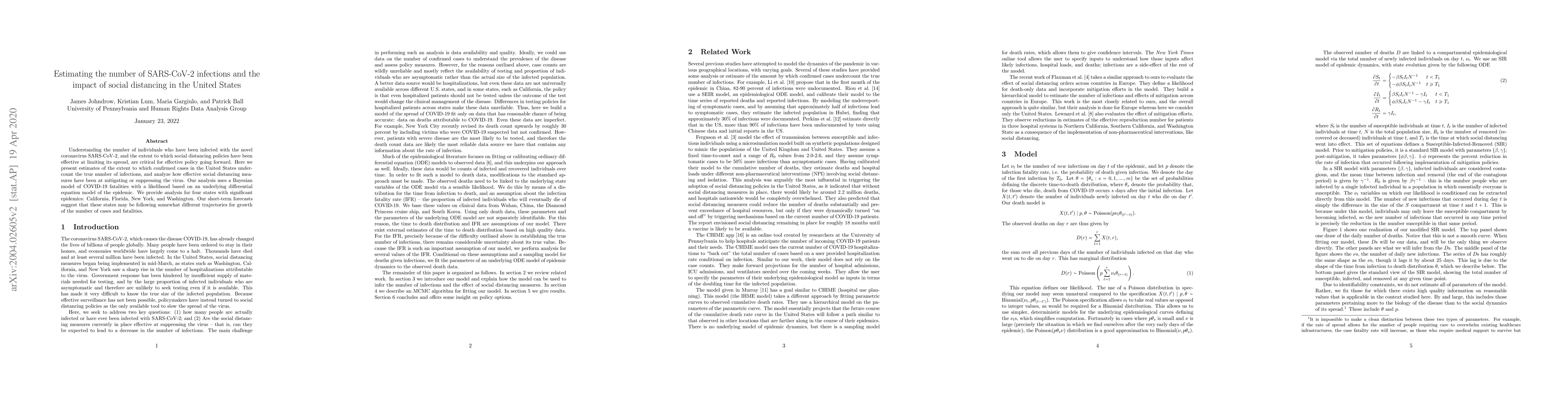 This paper estimates the true number of SARS-CoV-2 infections in the U.S. and evaluates the impact of social distancing, using a Bayesian model for four states: California, Florida, New York, and Washington. The analysis suggests varying trajectories for case and fatality growth across these states.