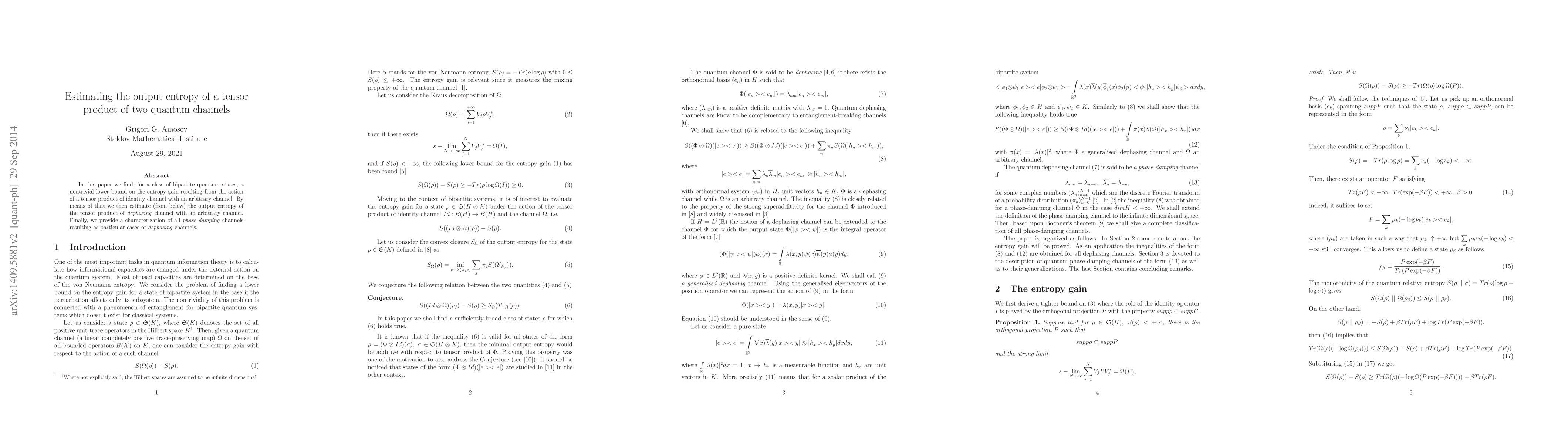 This paper establishes a lower bound on entropy gain from tensor product of channels and estimates output entropy for dephasing channel with an arbitrary channel.