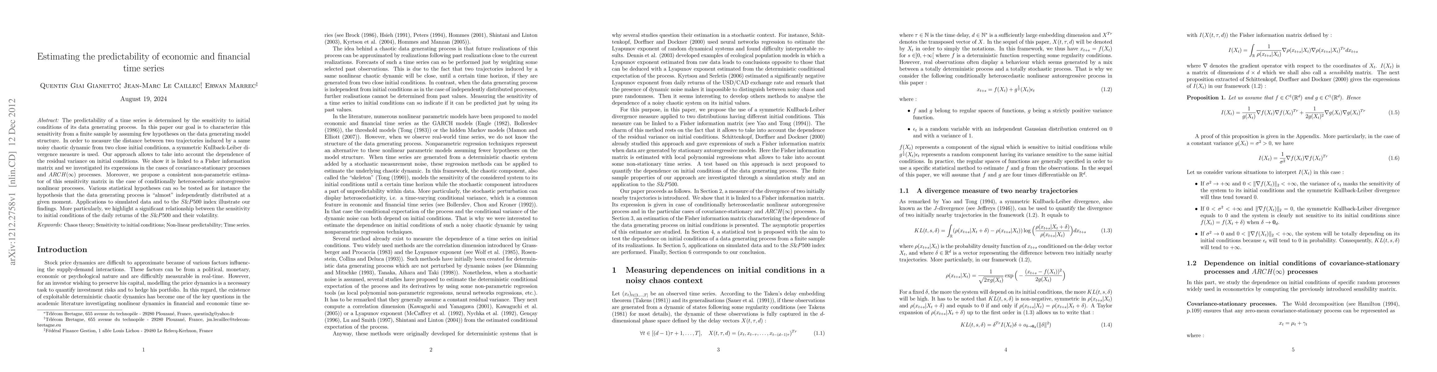The predictability of a time series is determined by the sensitivity to initial conditions of its data generating process. In this paper our goal is to characterize this sensitivity from a finite sample by assuming few hypotheses on the data generating model structure. In order to measure the distance between two trajectories induced by a same noisy chaotic dynamic from two close initial conditions, a symmetric Kullback-Leiber divergence measure is used. Our approach allows to take into account the dependence of the residual variance on initial conditions. We show it is linked to a Fisher information matrix and we investigated its expressions in the cases of covariance-stationary processes and ARCH($\infty$) processes. Moreover, we propose a consistent non-parametric estimator of this sensitivity matrix in the case of conditionally heteroscedastic autoregressive nonlinear processes. Various statistical hypotheses can so be tested as for instance the hypothesis that the data generating process is "almost" independently distributed at a given moment. Applications to simulated data and to the stock market index S&P500 illustrate our findings. More particularly, we highlight a significant relationship between the sensitivity to initial conditions of the daily returns of the S&P 500 and their volatility.