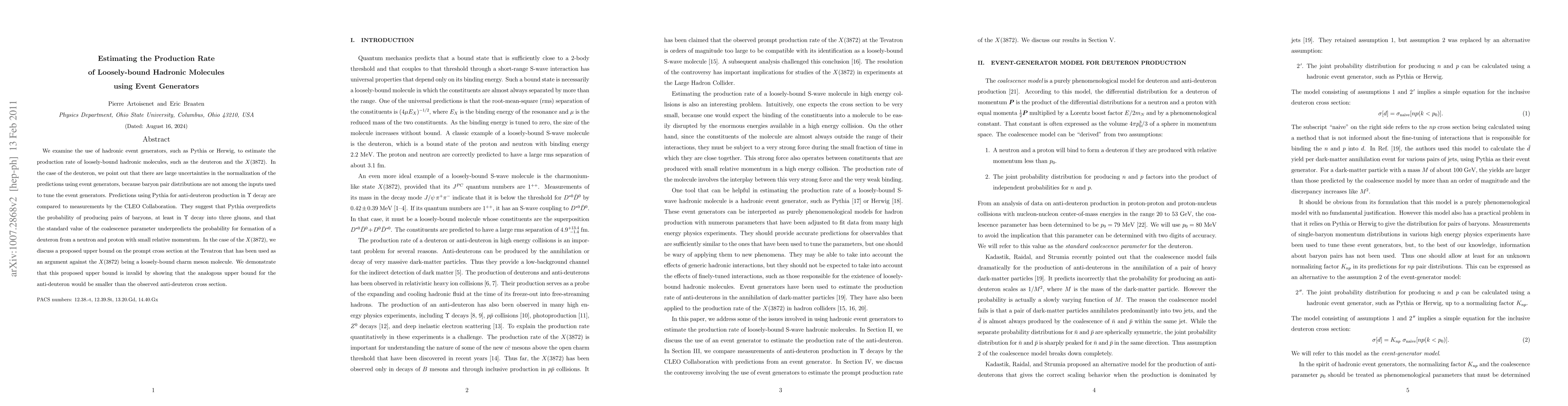 We examine the use of hadronic event generators, such as Pythia or Herwig, to estimate the production rate of loosely-bound hadronic molecules, such as the deuteron and the X(3872). In the case of the deuteron, we point out that there are large uncertainties in the normalization of the predictions using event generators, because baryon pair distributions are not among the inputs used to tune the event generators. Predictions using Pythia for anti-deuteron production in Upsilon decay are compared to measurements by the CLEO Collaboration. They suggest that Pythia overpredicts the probability of producing pairs of baryons, at least in Upsilon decay into three gluons, and that the standard value of the coalescence parameter underpredicts the probability for formation of a deuteron from a neutron and proton with small relative momentum. In the case of the X(3872), we discuss a proposed upper bound on the prompt cross section at the Tevatron that has been used as an argument against the X(3872) being a loosely-bound charm meson molecule. We demonstrate that this proposed upper bound is invalid by showing that the analogous upper bound for the anti-deuteron would be smaller than the observed anti-deuteron cross section.