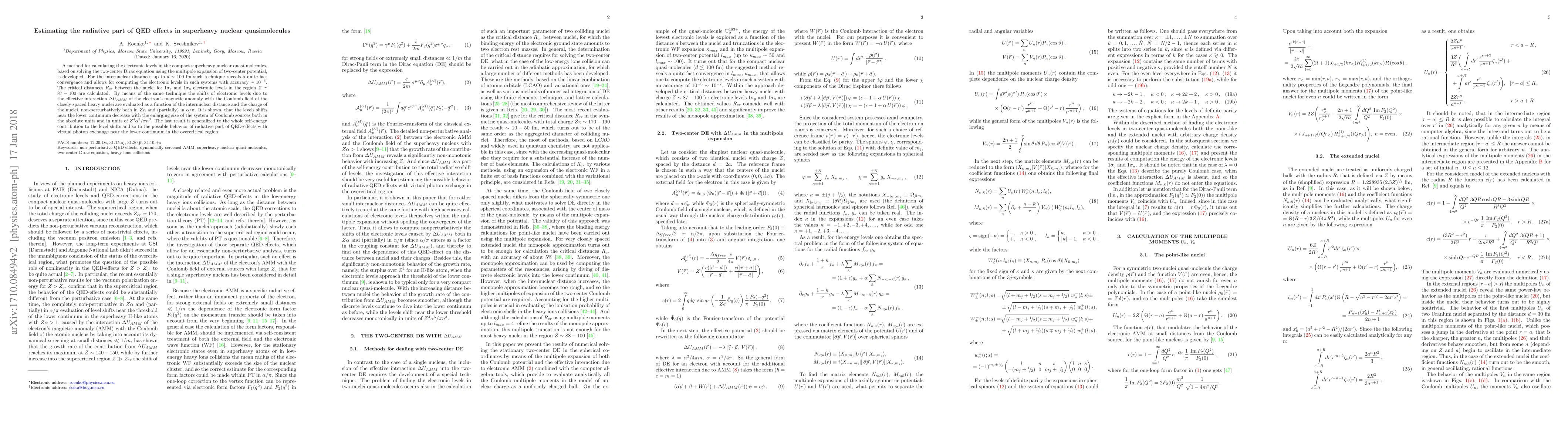 A method for calculating the electronic levels in the compact superheavy nuclear quasi-molecules, based on solving the two-center Dirac equation using the multipole expansion of two-center potential, is developed. For the internuclear distances up to $d\sim100$~fm such technique reveals a quite fast convergence and allows for computing the electronic levels in such systems with accuracy $\sim 10^{-6} $. The critical distances $R_{cr}$ between the nuclei for $1\sigma_g$ and $1\sigma_u$ electronic levels in the region $Z\simeq 87-100$ are calculated. By means of the same technique the shifts of electronic levels due to the effective interaction $\Delta U_{AMM}$ of the electron's magnetic anomaly with the Coulomb field of the closely spaced heavy nuclei are evaluated as a function of the internuclear distance and the charge of the nuclei, non-perturbatively both in $Z\alpha$ and (partially) in $\alpha/\pi$. It is shown, that the levels shifts near the lower continuum decrease with the enlarging size of the system of Coulomb sources both in the absolute units and in units of $Z^4 \alpha^5 / \pi n^3$. The last result is generalized to the whole self-energy contribution to the level shifts and so to the possible behavior of radiative part of QED-effects with virtual photon exchange near the lower continuum in the overcritical region.