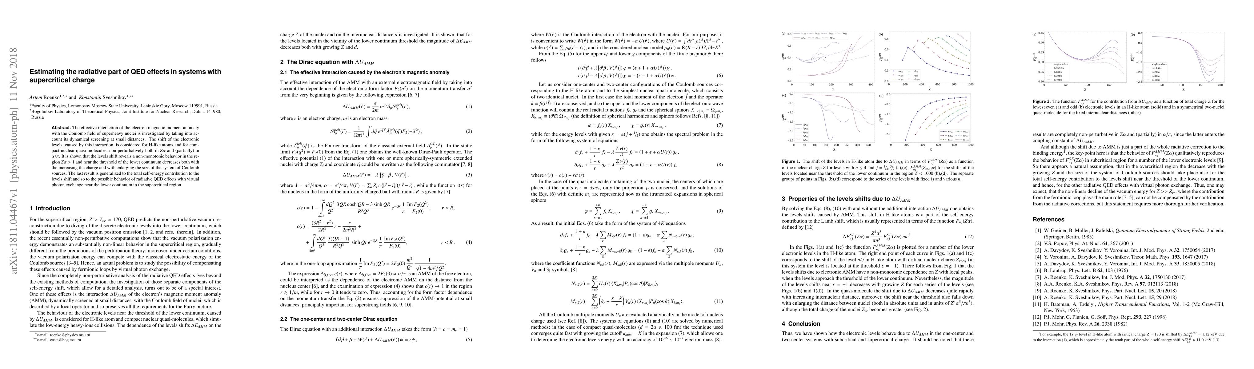 The effective interaction of the electron magnetic moment anomaly with the Coulomb field of superheavy nuclei is investigated by taking into account its dynamical screening at small distances. The shift of the electronic levels, caused by this interaction, is considered for H-like atoms and for compact nuclear quasi-molecules, non-perturbatively both in $Z\alpha$ and (partially) in $\alpha/\pi$. It is shown that the levels shift reveals a non-monotonic behavior in the region $Z\alpha>1$ and near the threshold of the lower continuum decreases both with the increasing the charge and with enlarging the size of the system of Coulomb sources. The last result is generalized to the total self-energy contribution to the levels shift and so to the possible behavior of radiative QED effects with virtual photon exchange near the lower continuum in the supercritical region.