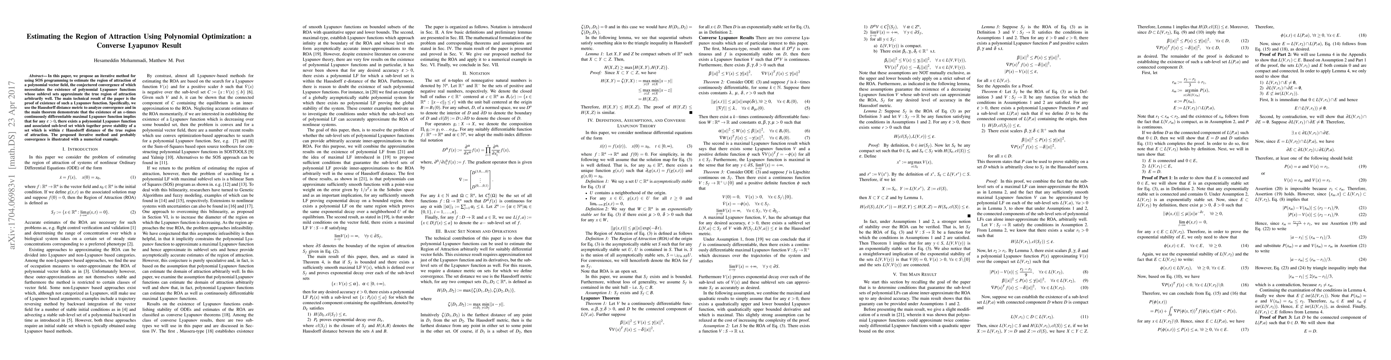 This paper proposes an iterative method using Sum-of-Squares (SOS) programming to estimate the region of attraction for polynomial vector fields. It proves the existence of a polynomial Lyapunov function that approximates the true region of attraction, demonstrating stability within a specified Hausdorff distance.