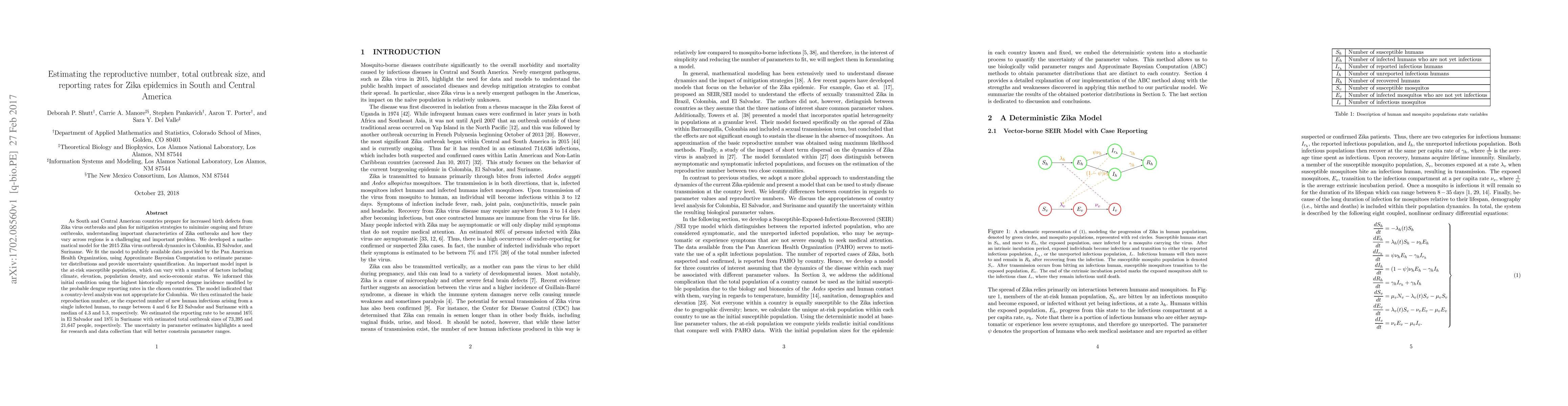 As South and Central American countries prepare for increased birth defects from Zika virus outbreaks and plan for mitigation strategies to minimize ongoing and future outbreaks, understanding important characteristics of Zika outbreaks and how they vary across regions is a challenging and important problem. We developed a mathematical model for the 2015 Zika virus outbreak dynamics in Colombia, El Salvador, and Suriname. We fit the model to publicly available data provided by the Pan American Health Organization, using Approximate Bayesian Computation to estimate parameter distributions and provide uncertainty quantification. An important model input is the at-risk susceptible population, which can vary with a number of factors including climate, elevation, population density, and socio-economic status. We informed this initial condition using the highest historically reported dengue incidence modified by the probable dengue reporting rates in the chosen countries. The model indicated that a country-level analysis was not appropriate for Colombia. We then estimated the basic reproduction number, or the expected number of new human infections arising from a single infected human, to range between 4 and 6 for El Salvador and Suriname with a median of 4.3 and 5.3, respectively. We estimated the reporting rate to be around 16% in El Salvador and 18% in Suriname with estimated total outbreak sizes of 73,395 and 21,647 people, respectively. The uncertainty in parameter estimates highlights a need for research and data collection that will better constrain parameter ranges.