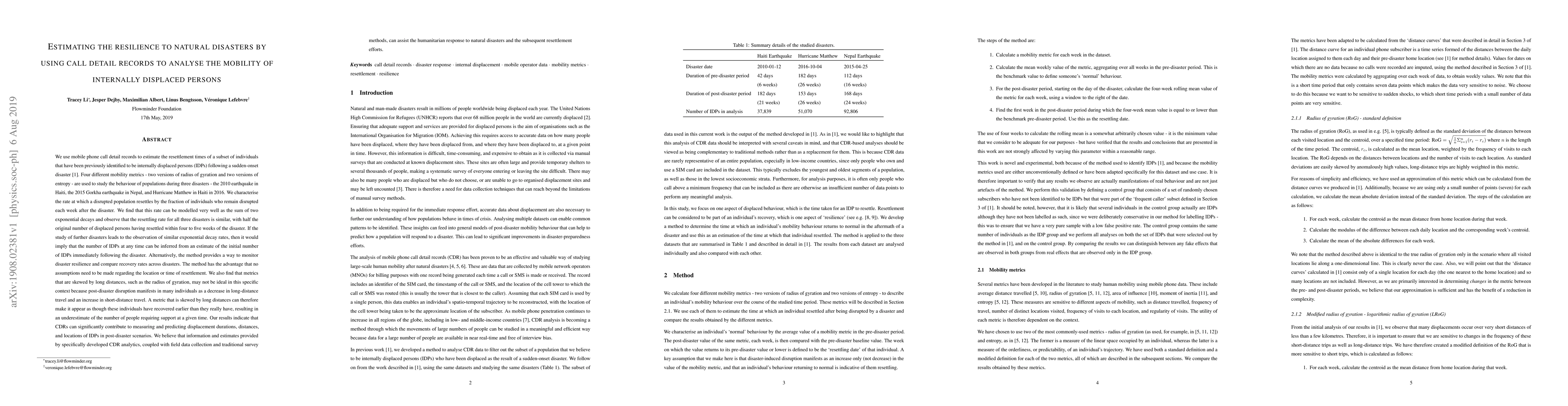 We use mobile phone call detail records to estimate the resettlement times of a subset of individuals that have been previously identified to be internally displaced persons (IDPs) following a sudden-onset disaster. Four different mobility metrics - two versions of radius of gyration and two versions of entropy - are used to study the behaviour of populations during three disasters - the 2010 earthquake in Haiti, the 2015 Gorkha earthquake in Nepal, and Hurricane Matthew in Haiti in 2016. We characterise the rate at which a disrupted population resettles by the fraction of individuals who remain disrupted each week after the disaster. We find that this rate can be modelled very well as the sum of two exponential decays and observe that the resettling rate for all three disasters is similar, with half the original number of displaced persons having resettled within four to five weeks of the disaster. If the study of further disasters leads to the observation of similar exponential decay rates, then it would imply that the number of IDPs at any time can be inferred from an estimate of the initial number of IDPs immediately following the disaster. Alternatively, the method provides a way to monitor disaster resilience and compare recovery rates across disasters. The method has the advantage that no assumptions need to be made regarding the location or time of resettlement. Our results indicate that CDRs can significantly contribute to measuring and predicting displacement durations, distances, and locations of IDPs in post-disaster scenarios. We believe that information and estimates provided by specifically developed CDR analytics, coupled with field data collection and traditional survey methods, can assist the humanitarian response to natural disasters and the subsequent resettlement efforts.