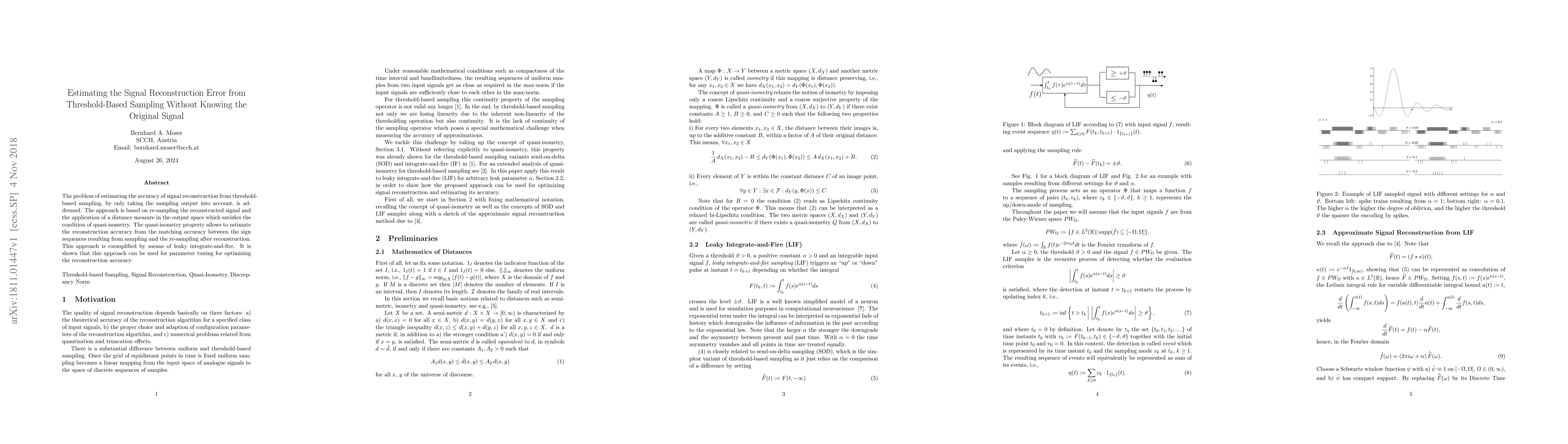 Researchers developed a method to estimate signal reconstruction accuracy from threshold-based sampling without knowing the original signal. They achieved this by re-sampling the reconstructed signal and using a distance measure in the output space, enabling parameter tuning for optimizing reconstruction accuracy.