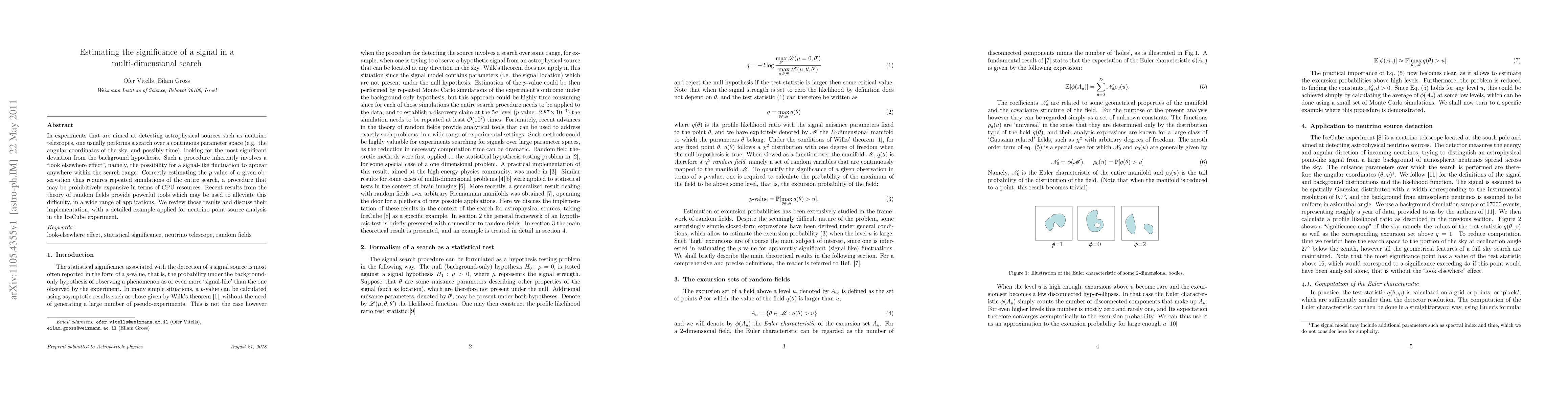 Researchers developed a method to estimate the significance of signals in multi-dimensional searches without requiring extensive CPU simulations, using tools from the theory of random fields. This approach can alleviate the 'look elsewhere effect' and improve the efficiency of experiments like neutrino telescopes.