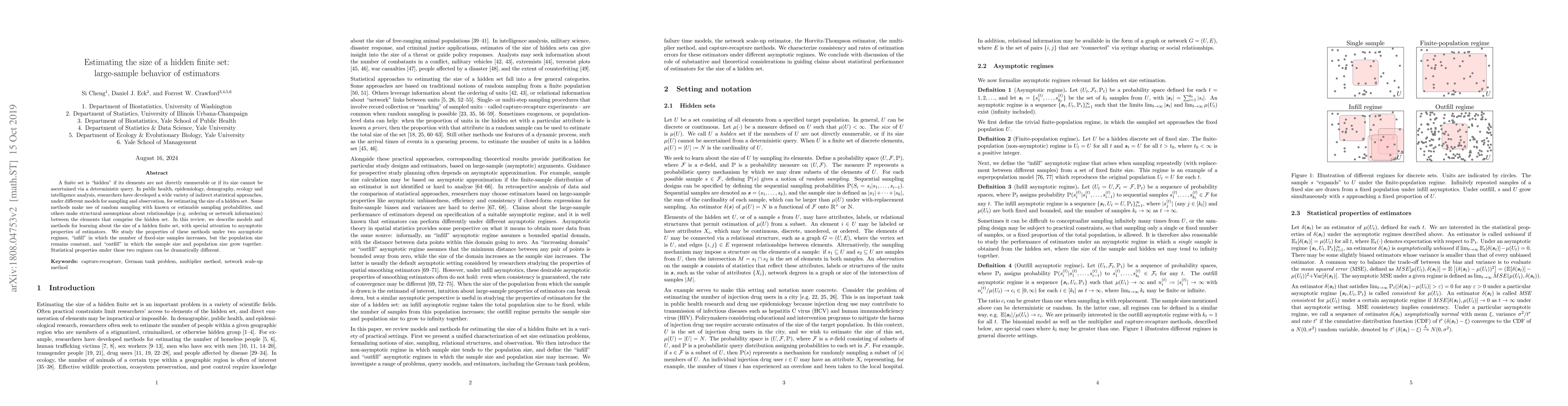 Researchers studied methods for estimating the size of a hidden finite set, revealing that statistical properties can differ significantly depending on two asymptotic regimes: infill and outfill. The study aims to provide insights into large-sample behavior of estimators.