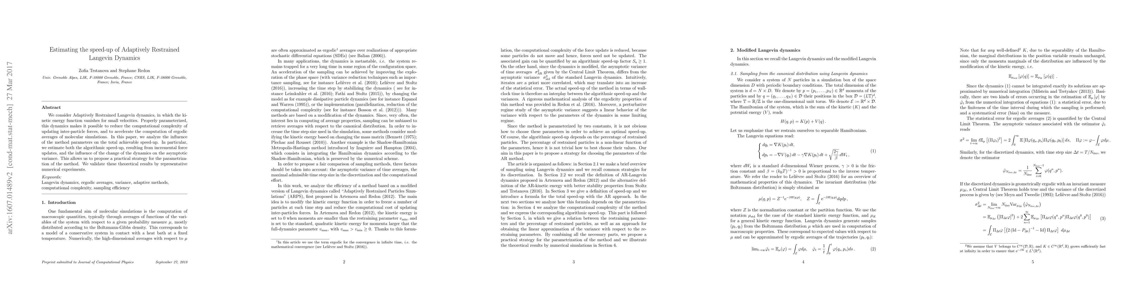 This paper investigates Adaptively Restrained Langevin Dynamics, which reduces computational complexity by vanishing kinetic energy for small velocities, and estimates the speed-up achieved through incremental force updates and reduced variance. Theoretical analysis and numerical experiments guide the optimal parametrization strategy for this method.