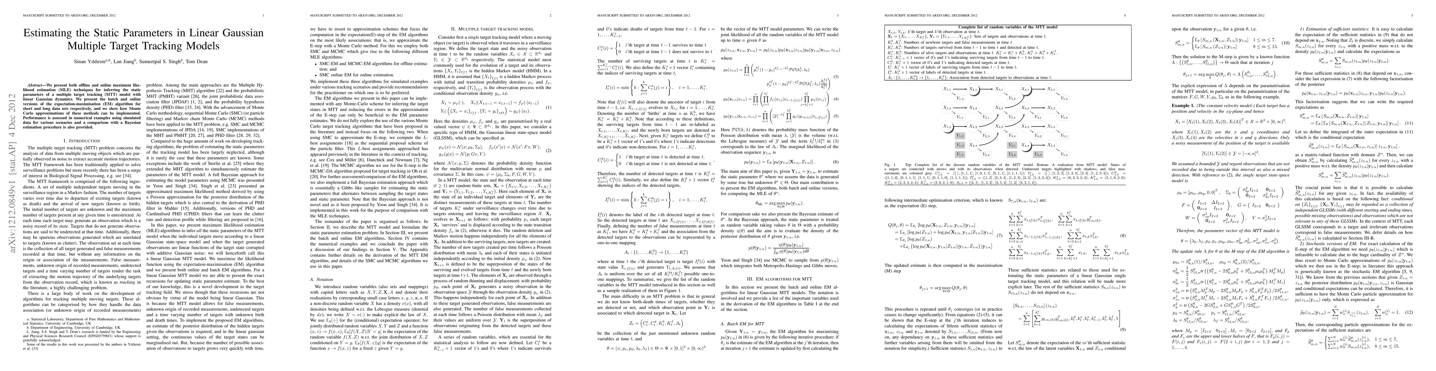 This paper proposes offline and online maximum likelihood estimation methods for determining static parameters in linear Gaussian multiple target tracking models, utilizing batch and online versions of the EM algorithm and Monte Carlo approximations. Performance is evaluated through numerical simulations and compared with Bayesian estimation techniques.