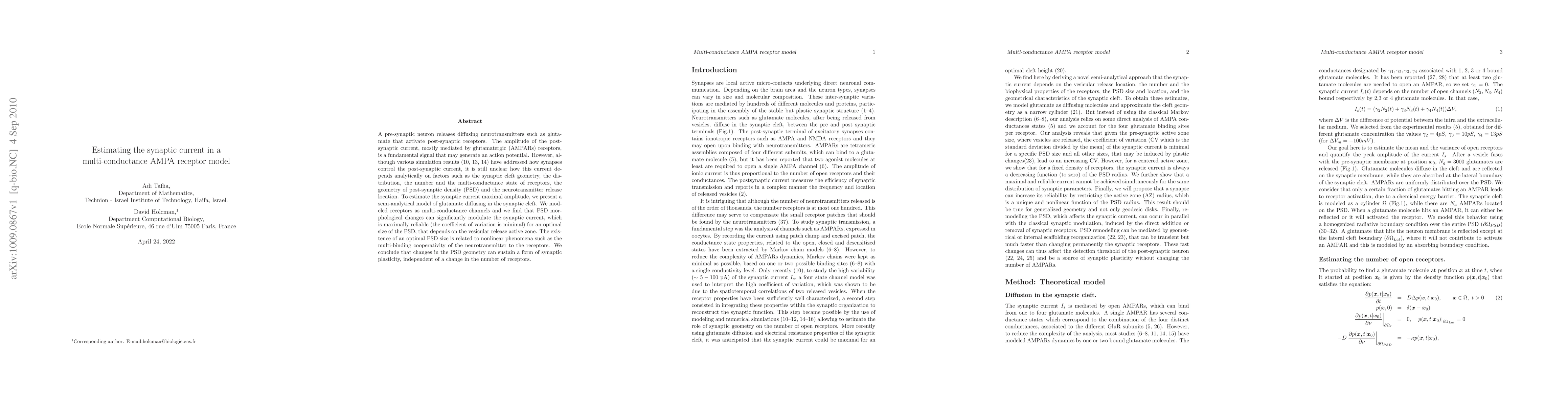A pre-synaptic neuron releases diffusing neurotransmitters such as glutamate that activate post-synaptic receptors. The amplitude of the post-synaptic current, mostly mediated by glutamatergic (AMPARs) receptors, is a fundamental signal that may generate an action potential. However, although various simulation results \cite{kullman,Barbour,Raghavachari} have addressed how synapses control the post-synaptic current, it is still unclear how this current depends analytically on factors such as the synaptic cleft geometry, the distribution, the number and the multi-conductance state of receptors, the geometry of post-synaptic density (PSD) and the neurotransmitter release location. To estimate the synaptic current maximal amplitude, we present a semi-analytical model of glutamate diffusing in the synaptic cleft. We modeled receptors as multi-conductance channels and we find that PSD morphological changes can significantly modulate the synaptic current, which is maximally reliable (the coefficient of variation is minimal) for an optimal size of the PSD, that depends on the vesicular release active zone. The existence of an optimal PSD size is related to nonlinear phenomena such as the multi-binding cooperativity of the neurotransmitter to the receptors. We conclude that changes in the PSD geometry can sustain a form of synaptic plasticity, independent of a change in the number of receptors.