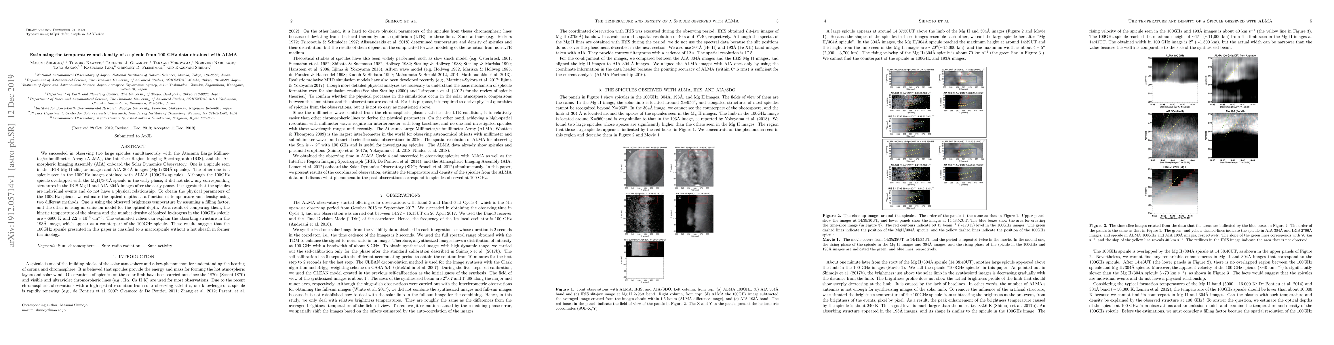 We succeeded in observing two large spicules simultaneously with the Atacama Large Millimeter/submillimeter Array (ALMA), the Interface Region Imaging Spectrograph (IRIS), and the Atmospheric Imaging Assembly (AIA) onboard the Solar Dynamics Observatory. One is a spicule seen in the IRIS Mg II slit-jaw images and AIA 304\AA\ images (MgII/304A spicule). The other one is a spicule seen in the 100GHz images obtained with ALMA (100GHz spicule). Although the 100GHz spicule overlapped with the MgII/304A spicule in the early phase, it did not show any corresponding structures in the IRIS Mg II and AIA 304A images after the early phase. It suggests that the spicules are individual events and do not have a physical relationship. To obtain the physical parameters of the 100GHz spicule, we estimate the optical depths as a function of temperature and density using two different methods. One is using the observed brightness temperature by assuming a filling factor, and the other is using an emission model for the optical depth. As a result of comparing them, the kinetic temperature of the plasma and the number density of ionized hydrogens in the 100GHz spicule are ~6800 K and 2.2 x 10^10 cm^-3. The estimated values can explain the absorbing structure in the 193A image, which appear as a counterpart of the 100GHz spicule. These results suggest that the 100GHz spicule presented in this paper is classified to a macrospicule without a hot sheath in former terminology.