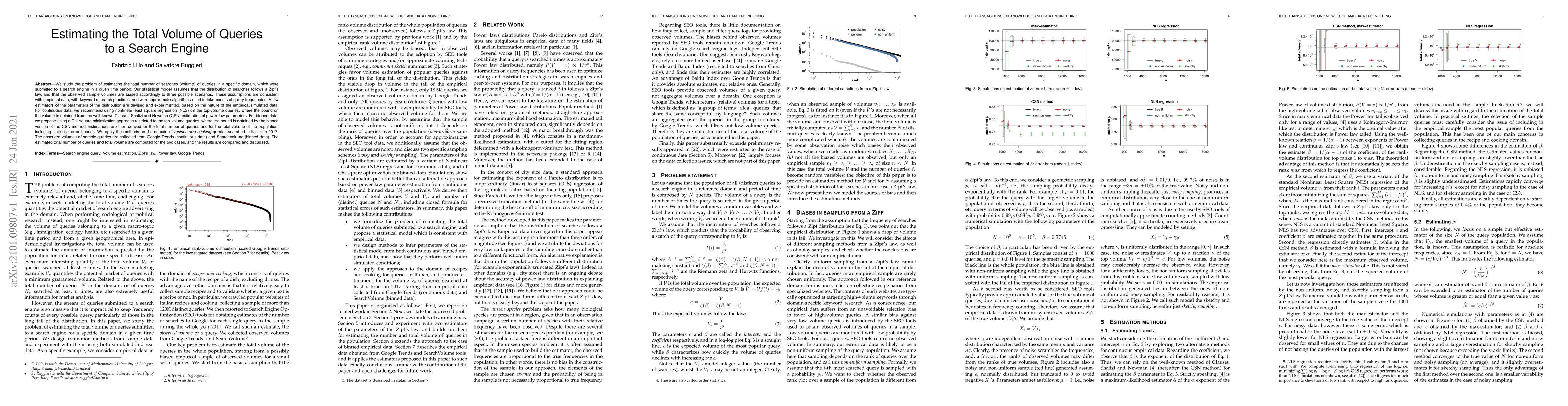 We study the problem of estimating the total number of searches (volume) of queries in a specific domain, which were submitted to a search engine in a given time period. Our statistical model assumes that the distribution of searches follows a Zipf's law, and that the observed sample volumes are biased accordingly to three possible scenarios. These assumptions are consistent with empirical data, with keyword research practices, and with approximate algorithms used to take counts of query frequencies. A few estimators of the parameters of the distribution are devised and experimented, based on the nature of the empirical/simulated data. For continuous data, we recommend using nonlinear least square regression (NLS) on the top-volume queries, where the bound on the volume is obtained from the well-known Clauset, Shalizi and Newman (CSN) estimation of power-law parameters. For binned data, we propose using a Chi-square minimization approach restricted to the top-volume queries, where the bound is obtained by the binned version of the CSN method. Estimations are then derived for the total number of queries and for the total volume of the population, including statistical error bounds. We apply the methods on the domain of recipes and cooking queries searched in Italian in 2017. The observed volumes of sample queries are collected from Google Trends (continuous data) and SearchVolume (binned data). The estimated total number of queries and total volume are computed for the two cases, and the results are compared and discussed.