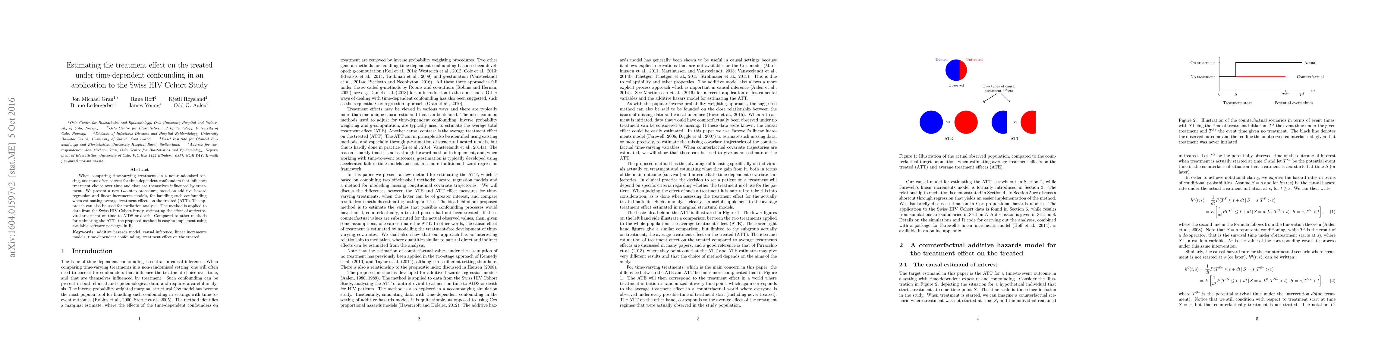 When comparing time-varying treatments in a non-randomised setting, one must often correct for time-dependent confounders that influence treatment choice over time and that are themselves influenced by treatment. We present a new two step procedure, based on additive hazard regression and linear increments models, for handling such confounding when estimating average treatment effects on the treated (ATT). The approach can also be used for mediation analysis. The method is applied to data from the Swiss HIV Cohort Study, estimating the effect of antiretroviral treatment on time to AIDS or death. Compared to other methods for estimating the ATT, the proposed method is easy to implement using available software packages in R.