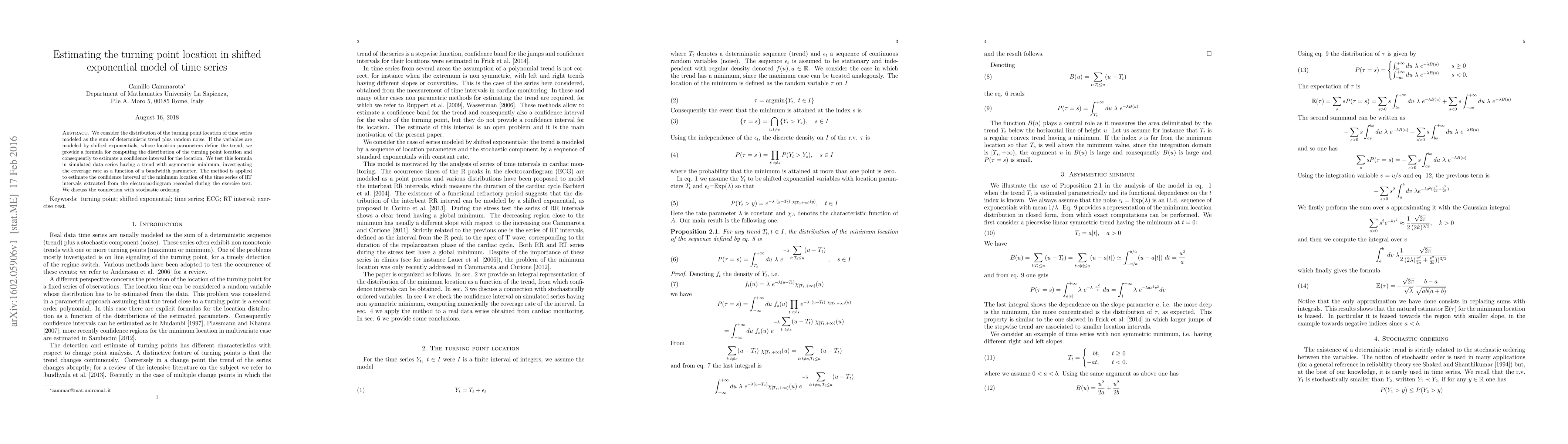 This paper develops a formula to compute the distribution of the turning point location in time series modeled by shifted exponentials, providing a confidence interval for the trend's minimum. The method is tested on simulated data and applied to electrocardiogram RT intervals, discussing its relation to stochastic ordering.
