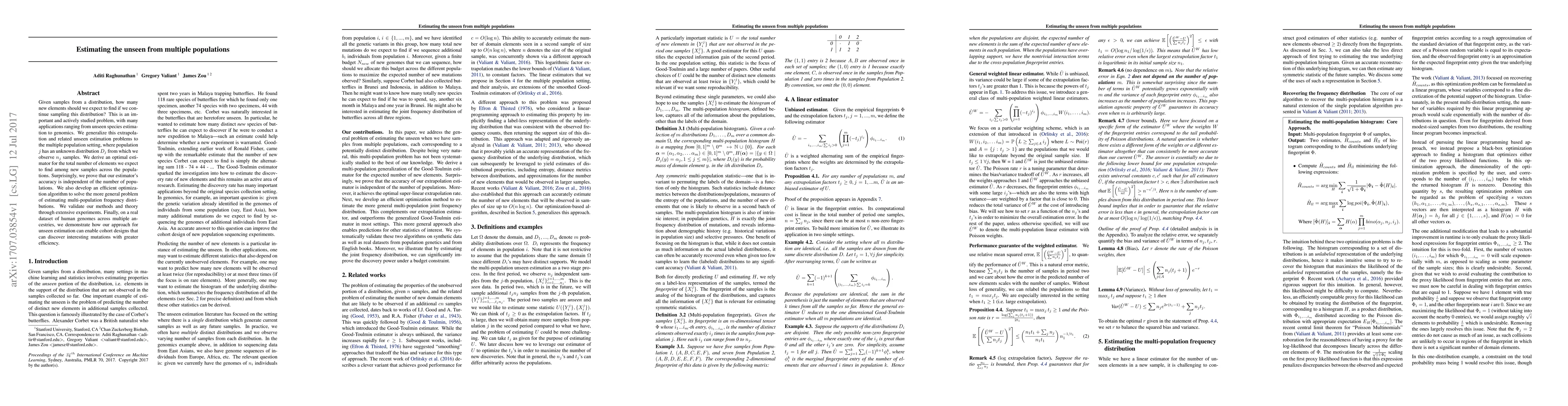 Given samples from a distribution, how many new elements should we expect to find if we continue sampling this distribution? This is an important and actively studied problem, with many applications ranging from unseen species estimation to genomics. We generalize this extrapolation and related unseen estimation problems to the multiple population setting, where population $j$ has an unknown distribution $D_j$ from which we observe $n_j$ samples. We derive an optimal estimator for the total number of elements we expect to find among new samples across the populations. Surprisingly, we prove that our estimator's accuracy is independent of the number of populations. We also develop an efficient optimization algorithm to solve the more general problem of estimating multi-population frequency distributions. We validate our methods and theory through extensive experiments. Finally, on a real dataset of human genomes across multiple ancestries, we demonstrate how our approach for unseen estimation can enable cohort designs that can discover interesting mutations with greater efficiency.