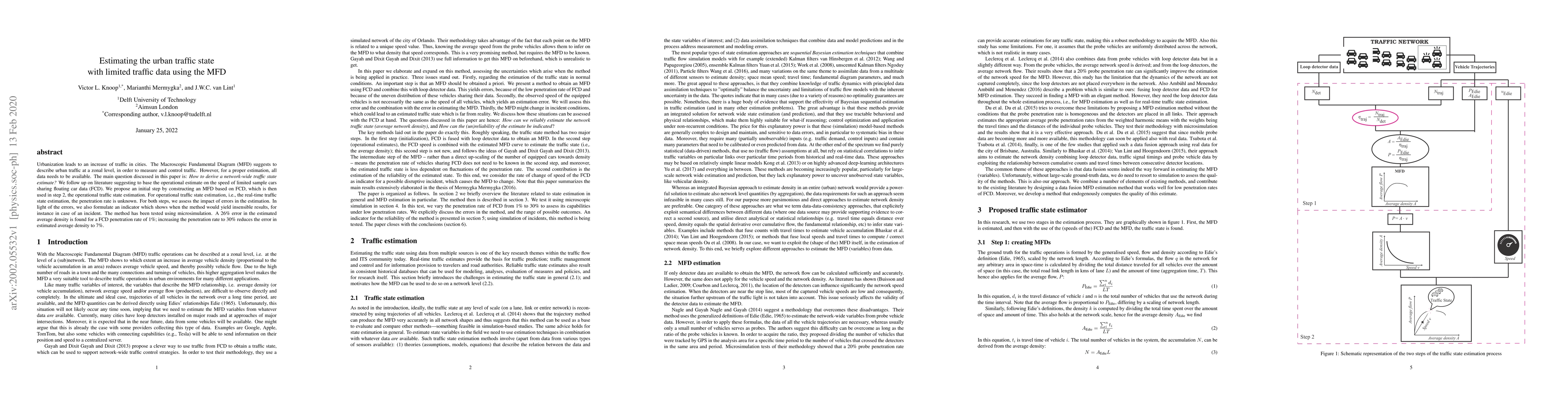 This paper proposes a method to estimate the urban traffic state using the Macroscopic Fundamental Diagram (MFD) and limited floating car data (FCD). It constructs an MFD based on FCD and uses it for real-time traffic state estimation, assessing the impact of errors and formulating an indicator to detect insensible results, especially during incidents. Simulation results show a 26% error at 1% FCD penetration, which reduces to 7% at 30%.