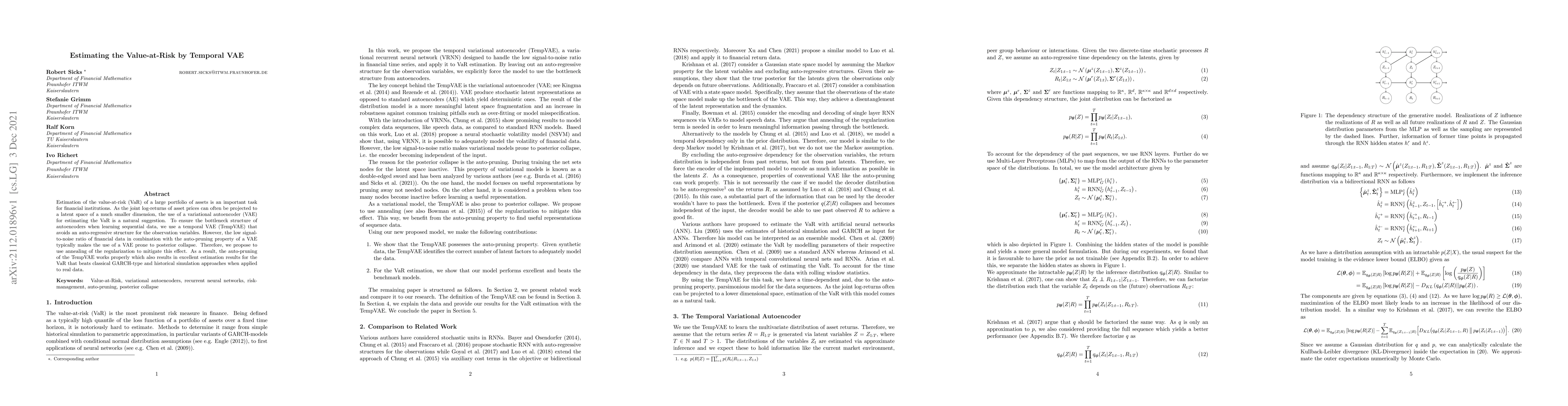 Estimation of the value-at-risk (VaR) of a large portfolio of assets is an important task for financial institutions. As the joint log-returns of asset prices can often be projected to a latent space of a much smaller dimension, the use of a variational autoencoder (VAE) for estimating the VaR is a natural suggestion. To ensure the bottleneck structure of autoencoders when learning sequential data, we use a temporal VAE (TempVAE) that avoids an auto-regressive structure for the observation variables. However, the low signal- to-noise ratio of financial data in combination with the auto-pruning property of a VAE typically makes the use of a VAE prone to posterior collapse. Therefore, we propose to use annealing of the regularization to mitigate this effect. As a result, the auto-pruning of the TempVAE works properly which also results in excellent estimation results for the VaR that beats classical GARCH-type and historical simulation approaches when applied to real data.