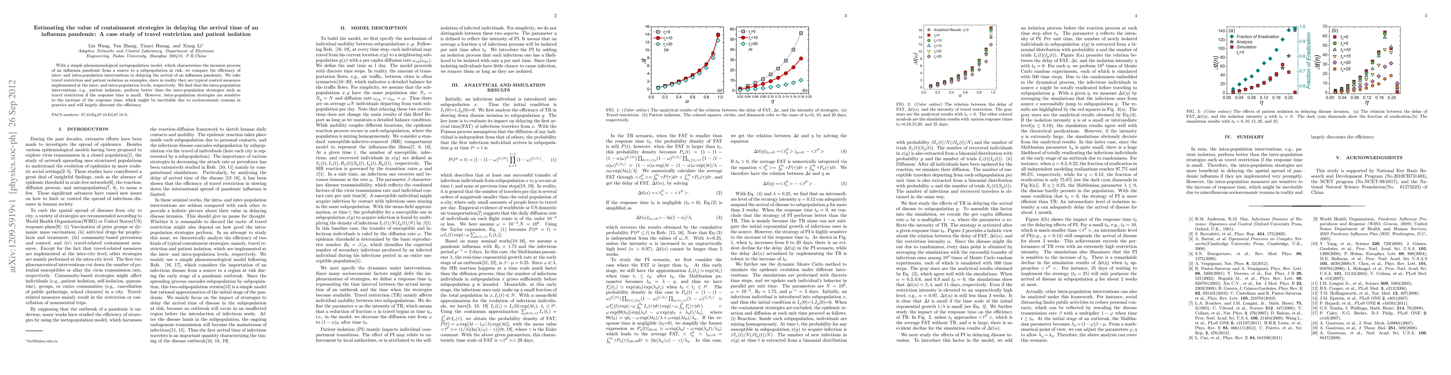 With a simple phenomenological metapopulation model, which characterizes the invasion process of an influenza pandemic from a source to a subpopulation at risk, we compare the efficiency of inter- and intra-population interventions in delaying the arrival of an influenza pandemic. We take travel restriction and patient isolation as examples, since in reality they are typical control measures implemented at the inter- and intra-population levels, respectively. We find that the intra-population interventions, e.g., patient isolation, perform better than the inter-population strategies such as travel restriction if the response time is small. However, intra-population strategies are sensitive to the increase of the response time, which might be inevitable due to socioeconomic reasons in practice and will largely discount the efficiency.