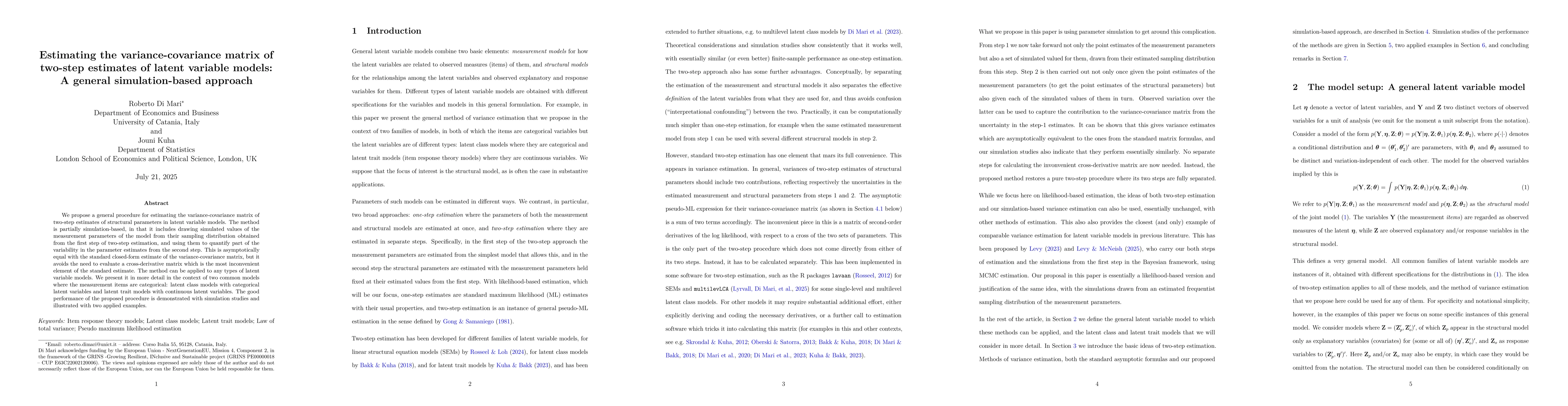 The paper proposes a simulation-based approach to estimate the variance-covariance matrix of two-step estimates in latent variable models, avoiding the need to evaluate a cross-derivative matrix and applicable to any types of latent variable models, particularly demonstrated for models with categorical measurement items.