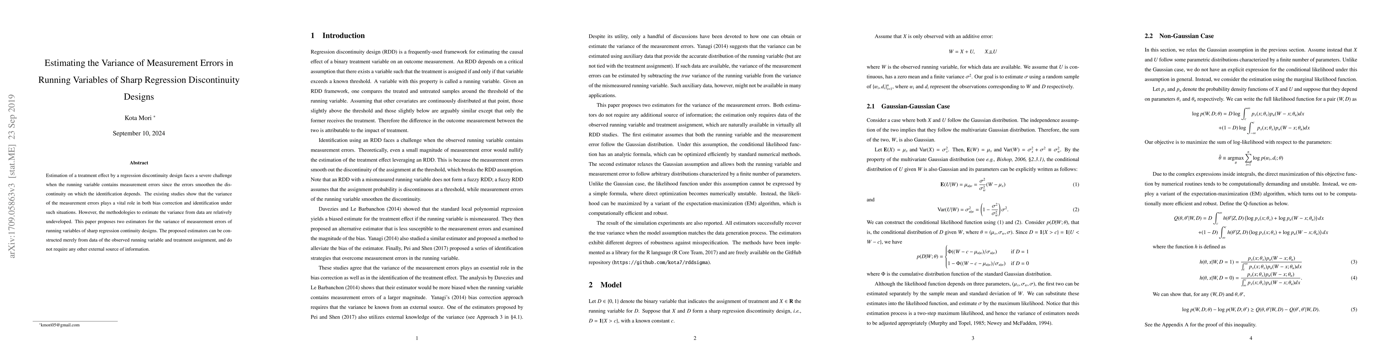 This paper proposes two new estimators to determine the variance of measurement errors in the running variable of sharp regression discontinuity designs, addressing the challenge of bias correction and identification when the running variable is imprecisely measured. The estimators are data-driven and do not require external information.