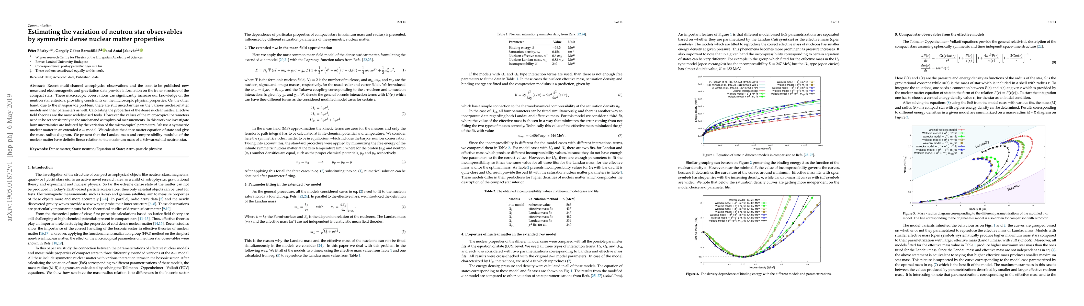 Recent multi-channel astrophysics observations and the soon-to-be published new measured electromagnetic and gravitation data provide information on the inner structure of the compact stars. These macroscopic observations can significantly increase our knowledge on the neutron star enteriors, providing constraints on the microscopic physical properties. On the other hand, due to the masquarade problem, there are still uncertainties on the various nuclear-matter models and their parameters as well. Calculating the properties of the dense nuclear matter, effective field theories are the most widely-used tools. However the values of the microscopical parameters need to be set consistently to the nuclear and astrophysical measurements. In this work we investigate how uncertainties are induced by the variation of the microscopical parameters. We use a symmetric nuclear matter in an extended $\sigma$-$\omega$ model. We calculate the dense matter equation of state and give the mass-radius diagram. We present that the Landau mass and compressibility modulus of the nuclear matter have definite linear relation to the maximum mass of a Schwarzschild neutron star.